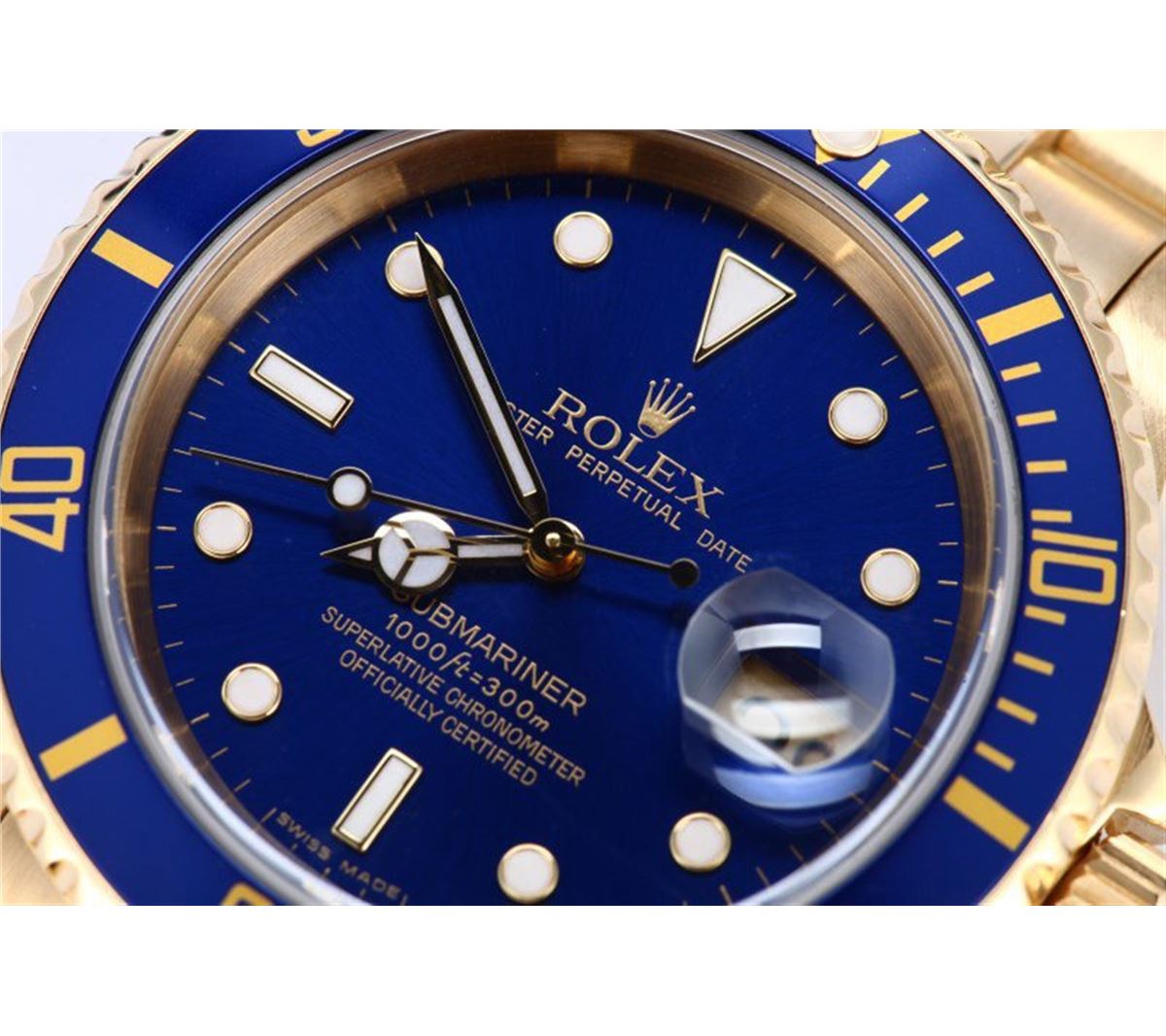 Model/Style-Submariner 16618 Serial/Year-Random Features-Automatic movement w/ date, waterproof screw-down crown, unidirectional rotatable diver's bezel, scratch-resistant sapphire crystal Case-18k yellow gold (40mm) w/ blue bezel insert Bracelet-18k yellow gold Oyster #9244