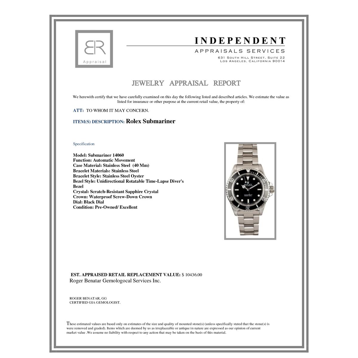 Model/Style-Submariner 14060 Serial/Year-Random Features-Automatic movement, waterproof screw-down crown, unidirectional rotatable time-lapse diver's bezel, scratch-resistant sapphire crystal Case-Stainless steel (40 mm) Bracelet-Stainless steel Oyster #9192
