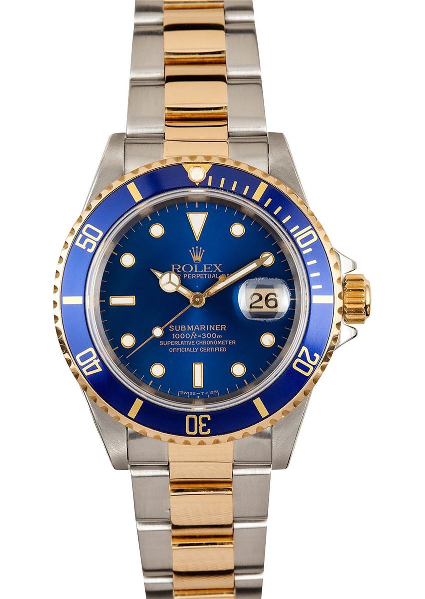 Model/Style-Submariner 16613 Serial/Year-Random Features-Automatic movement w/date, waterproof screw-down crown, unidirectional rotatable time-lapse diver's bezel, waterproof to 1,000 ft, scratch-resistant sapphire crystal Case-Stainless steel and 18k yellow gold w/ blue bezel insert (40mm) Bracelet-Stainless steel and 18k yellow gold Oyster #9248