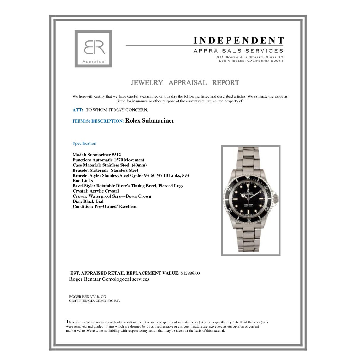 Model/Style-Submariner 5512 Serial/Year-Random Features-Automatic 1570 movement, domed acrylic crystal, waterproof screw-down crown Case-Stainless steel, rotatable diver's timing bezel, pierced lugs, aged bezel insert Bracelet-Stainless Steel Oyster 93150 w/ 10 links, 593 end links #9286