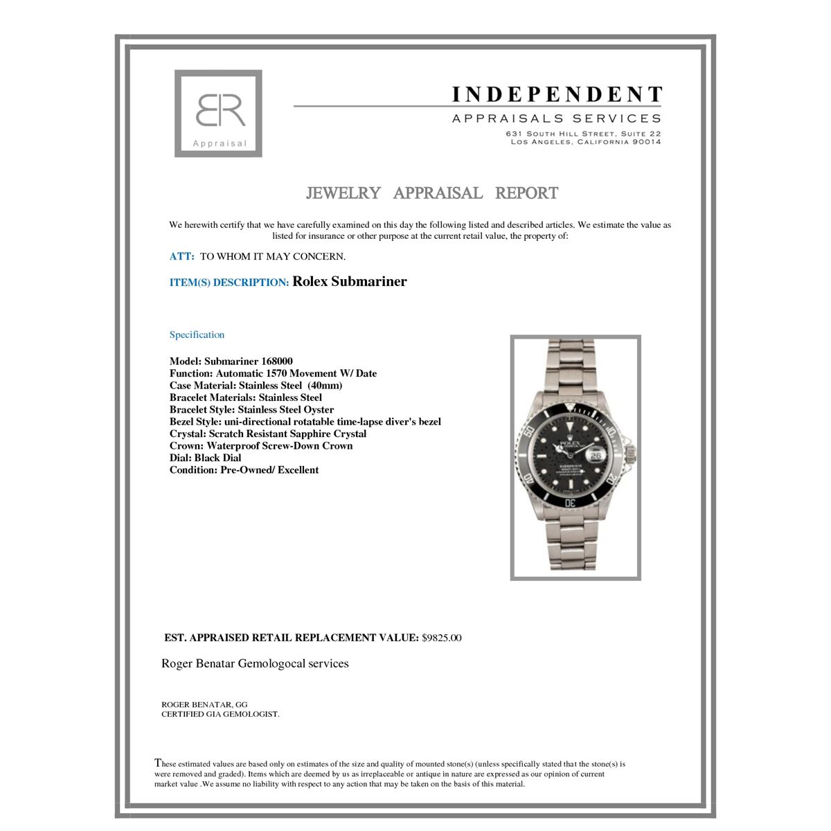 Model/Style-Submariner 168000 Serial/Year-Random Features-Automatic 1570 movement w/ date, waterproof screw-down crown, uni-directional rotatable time-lapse diver's bezel, scratch-resistant sapphire crystal Case-Stainless steel (40mm) Bracelet-Stainless Steel Oyster #9271