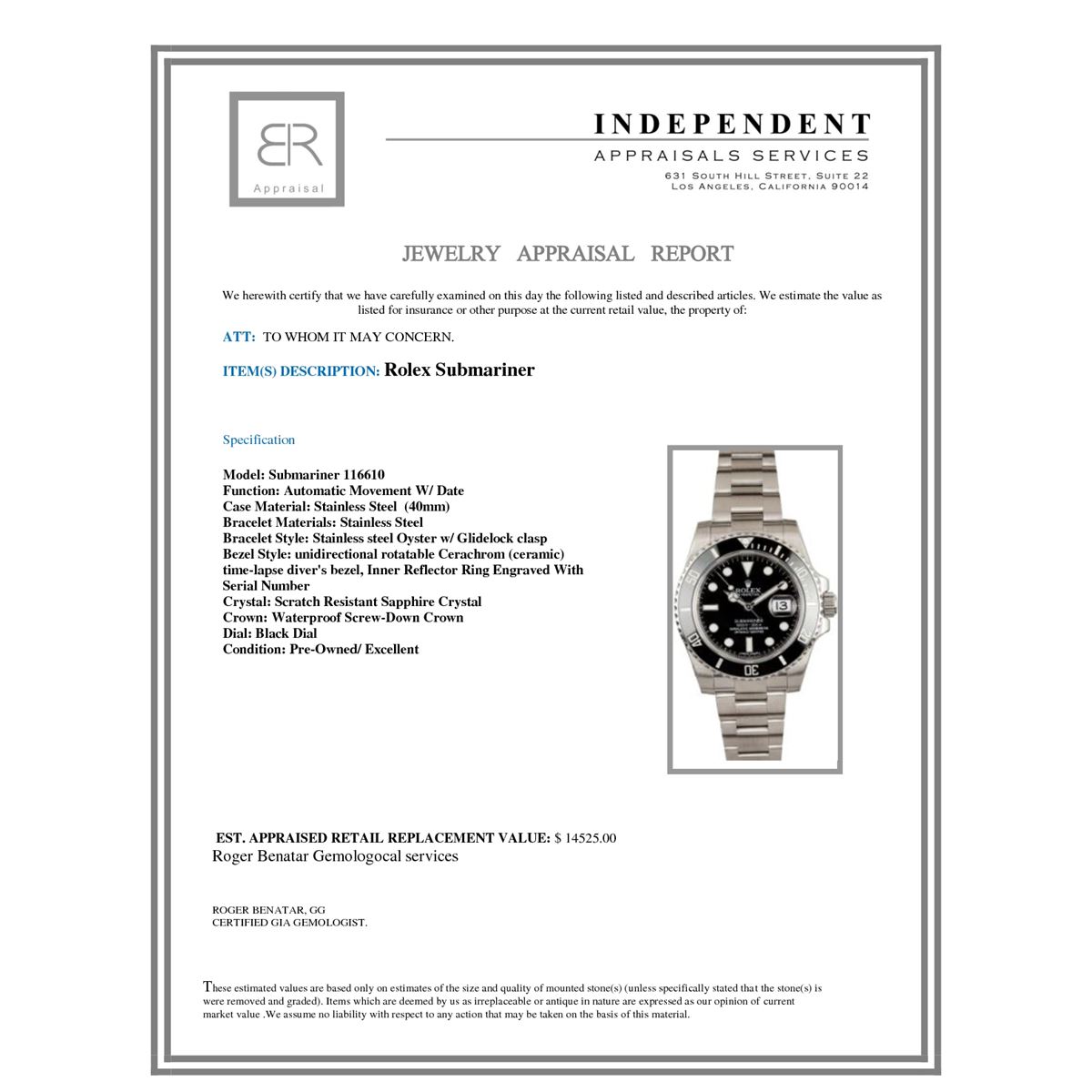 Model/Style-Submariner 116610 Serial/Year-Random Features-Automatic movement, waterproof screw-down crown, unidirectional rotatable Cerachrom (ceramic) time-lapse diver's bezel, scratch-resistant sapphire crystal Case-Stainless steel (40mm), inner reflector ring engraved w/ serial number Bracelet-Stainless steel Oyster w/ Glidelock clasp #9223