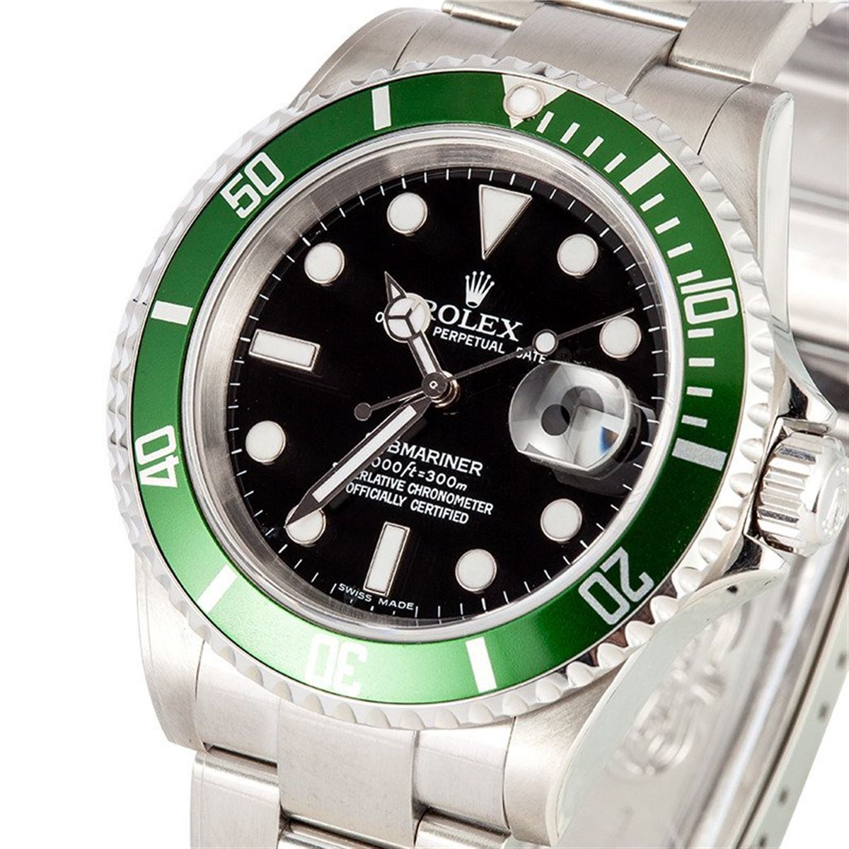 Model/Style-Submariner 16610V Serial/Year-Random Features-Automatic movement w/ date, waterproof screw-down crown, unidirectional rotatable diver's bezel, scratch-resistant sapphire crystal, inner reflector ring engraved with serial number Case-Stainless steel w/ green bezel (40mm) Anniversary Edition, no holes Bracelet-Stainless Steel Oyster #9214