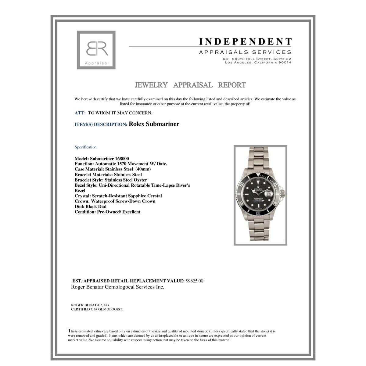 Model/Style-Submariner 168000 Serial/Year-Random Features-Automatic 1570 movement w/ date, waterproof screw-down crown, uni-directional rotatable time-lapse diver's bezel, scratch-resistant sapphire crystal Case-Stainless steel (40mm) Bracelet-Stainless Steel Oyster #9190