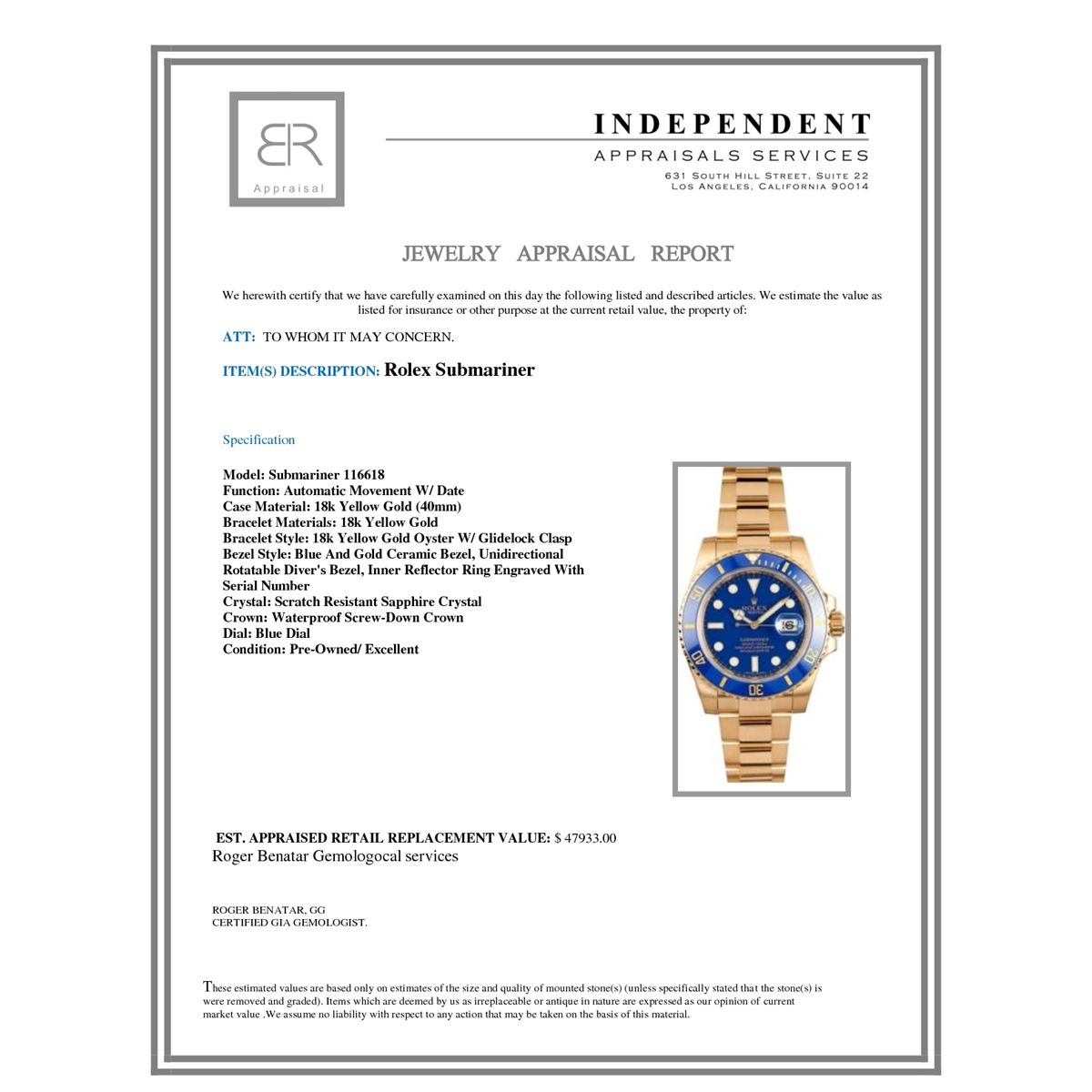 Model/Style-Submariner 116618 Serial/Year-Random Features-Automatic movement w/ date, waterproof screw-down crown, unidirectional rotatable diver's bezel, scratch-resistant sapphire crystal Case-18k yellow gold (40mm) w/ blue and gold ceramic bezel, inner reflector ring engraved w/ serial number Bracelet-18k yellow gold Oyster w/ Glidelock clasp #9241
