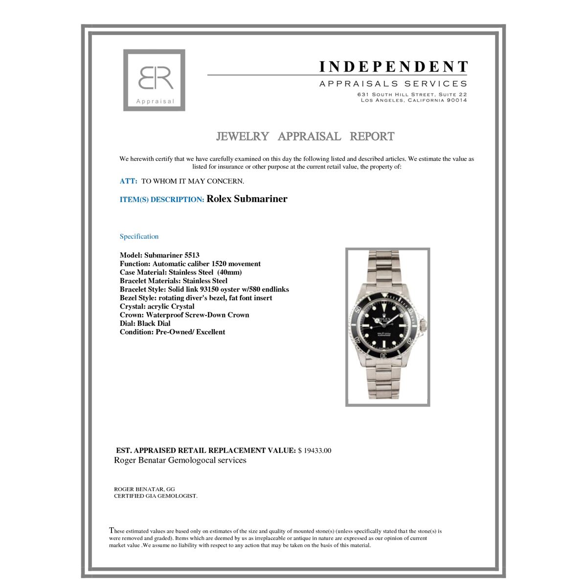 Model/Style-Submariner 5513 Serial/Year-Random Features-Automatic caliber 1520 movement, rotating diver's bezel, acrylic crystal, water resistant screw down crown Case-Stainless steel case (40mm). Case is in mint condition with sharp beveled edges and original fat font insert. Water resistant screw down crown. Bracelet-Solid link 93150 oyster w/580 endlinks. Original bracelet is in mint condition with zero stretch. #9277