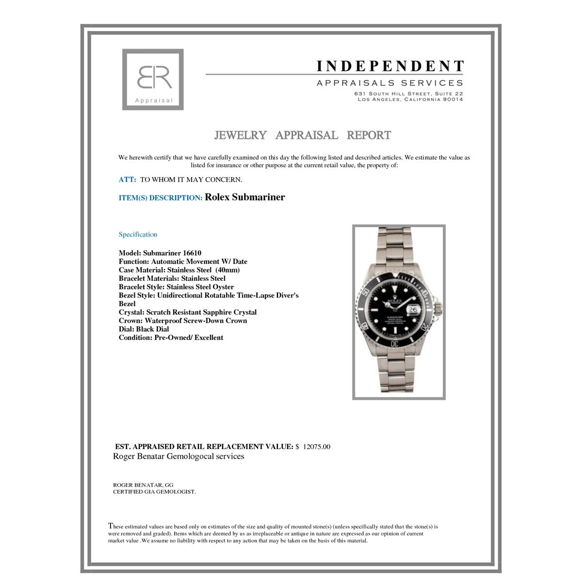 Not all jewelry, watches or loose stones are appraised and the appraisals are provided for bidders only in certain instances at the discretion of the Company. Appraisals, if any should be use to verify gemstone and or metal weights. The appraisals should not be used for valuation of any item. No guarantee, warranty or representation is intended by the Company in any appraisal. All dimensions and weights of such lots are approximate and are consistent with standards and practices in the industry. Condition reports are provided as a service to the prospective buyer. Bidders should take note that such descriptions are not warranties and that watches may need general service, change of battery or further repairs for which the buyer is solely responsible