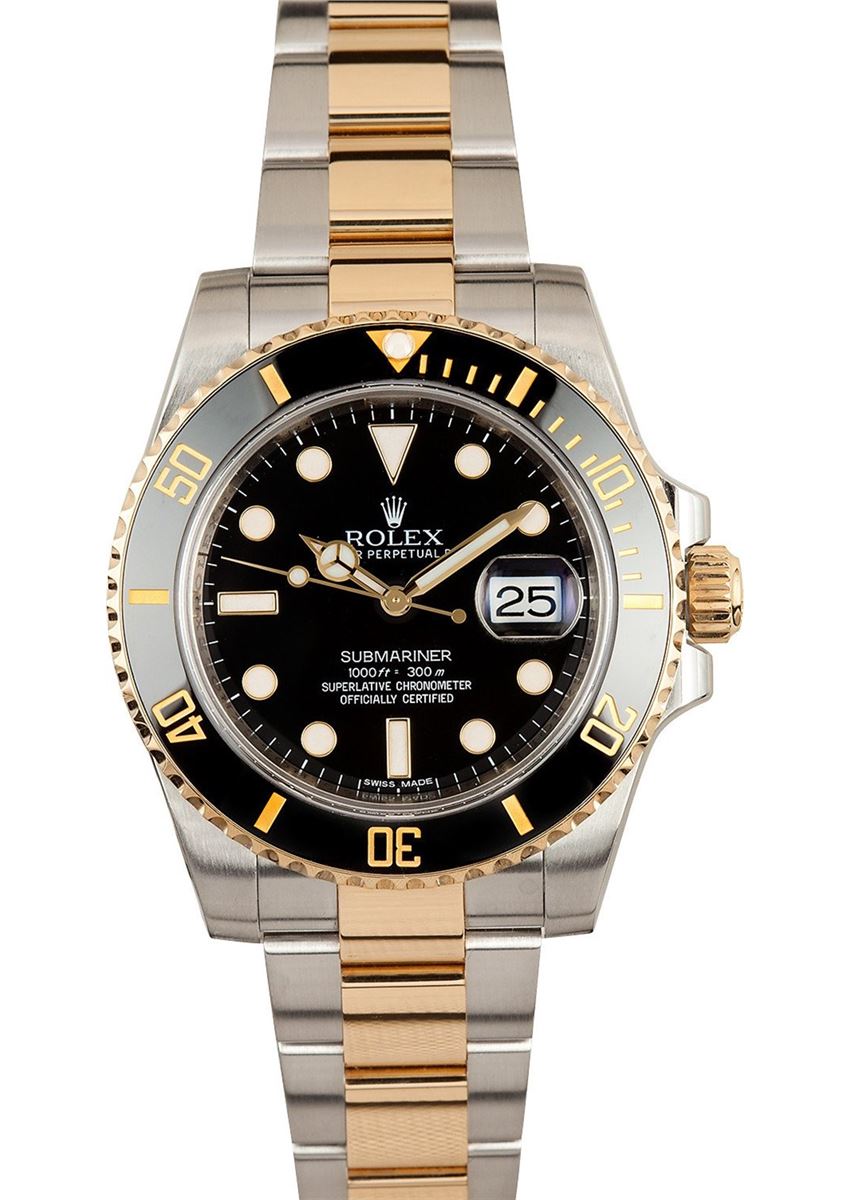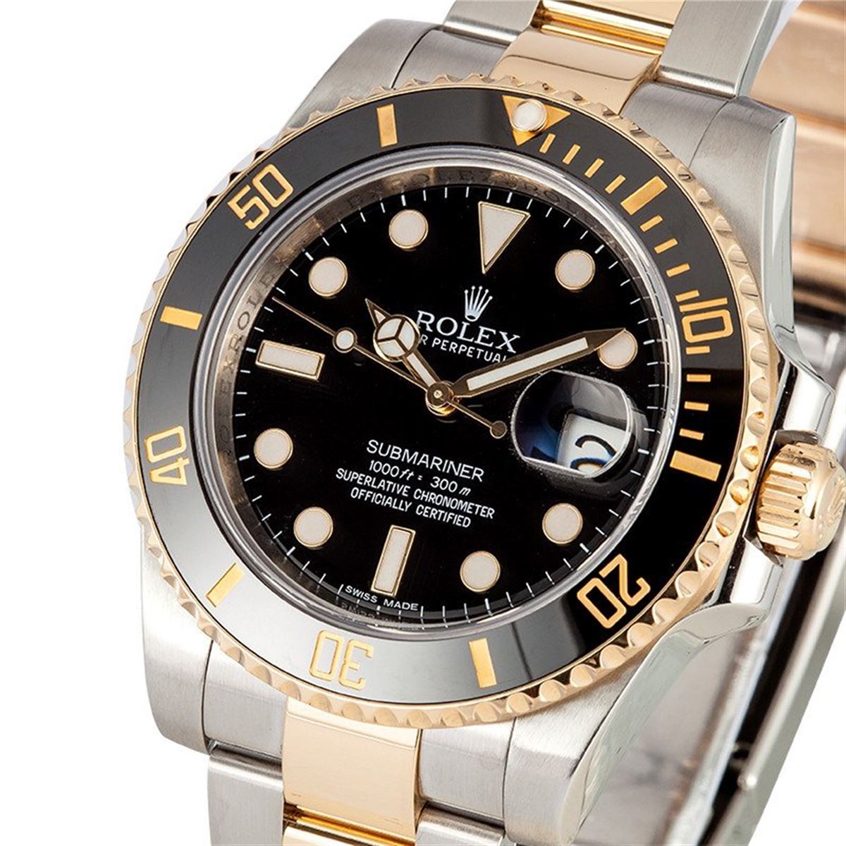 Model/Style-Submariner 116613 Serial/Year-Random Features-Automatic movement w/ date, waterproof screw-down crown, unidirectional rotatable Cerachrom (ceramic) time-lapse diver's bezel, scratch-resistant sapphire crystal Case-Stainless steel & 18k Gold (40mm), inner reflector ring engraved with serial number Bracelet-Stainless steel and 18k Gold Oyster with Glidelock clasp #9195
