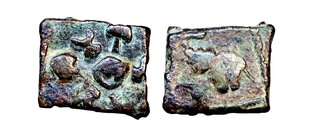 Pre Satavahana, Vidarbha (2nd-1st Century BC), Copper Unit, 1.34 gms, Obverse: elephant to left with raised truck, Reverse: nandiapda, Unlisted, very fine, scarce.