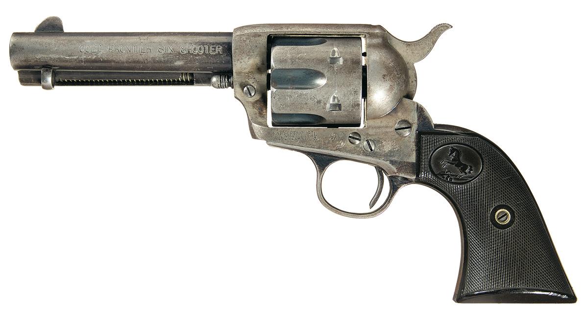 This pre-World War I Colt Frontier Six-Shooter Single Action Army revolver was manufactured in 1902, with standard blade and frame "V" notch sights. The two line, three patent date marking with the circled Rampant Colt is marked on the left side of the frame. The barrel has the following markings: the short two line address on top, the desirable original "COLT FRONTIER SIX SHOOTER" roll marking on the left side, and the tiny number "44" marked on the underside at the frame. The revolver has a casehardened frame with remaining metal surfaces blue and two-piece checkered hard rubber grips with the Rampant Colt at the tops. All serial numbers match. This turn-of-the century produced Colt Single Action Army revolver is a desirable companion piece for a Winchester SRC (in the same 44-40 caliber).