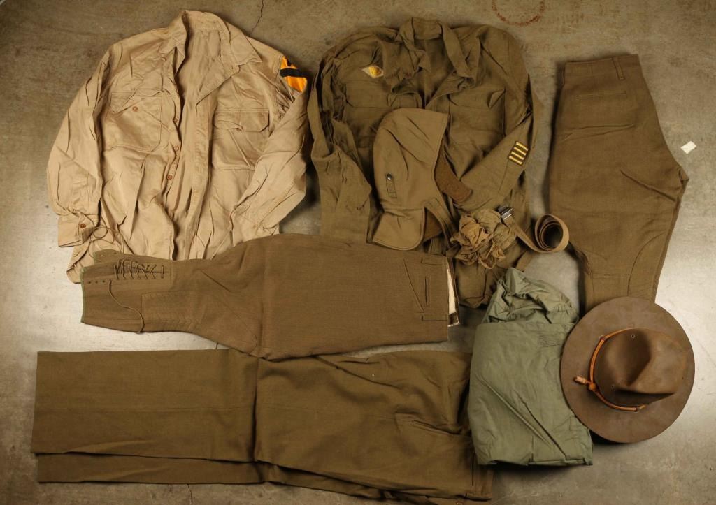 Including; 3 pairs jodhpurs-one marked 32/24, 2 jackets-one with cavalry patch. hat size 7 5/8, winter cap, mosquito netting, size 36 belt and a green canvas duffel bag.