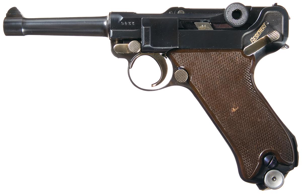 Condition: Near mintas professionally restored with 99% of the current blued finish. The edges and flat spots are sharp and distinct with no rounded over edges. The markings are clear and distinct, indicative of a very professional level of restoration. The various small parts also retain 99% of their restored straw colors. The grips are also in excellent condition with only a very small discoloration spot in the center of the left grip. The pistol has all matching numbers on the various parts except the magazine. A very nice and very representative example of a scarce pre-war Krieghoff luger pistol