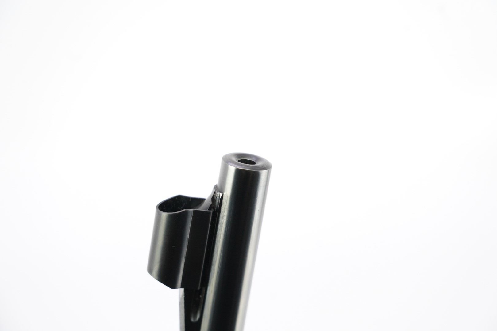 Sights / Optics: The front sight is a beaded blade dovetailed to a textured, ramped, hooded base fixed to the front of the barrel. The rear sight is a "U"-notch elevator sight dovetailed to a boss at the rear of the barrel. The chamber ring, but not the bridge, is drilled, tapped and filled for an optic (none present). The left-rear of the receiver is drilled, tapped and filled for a receiver sight (none present).