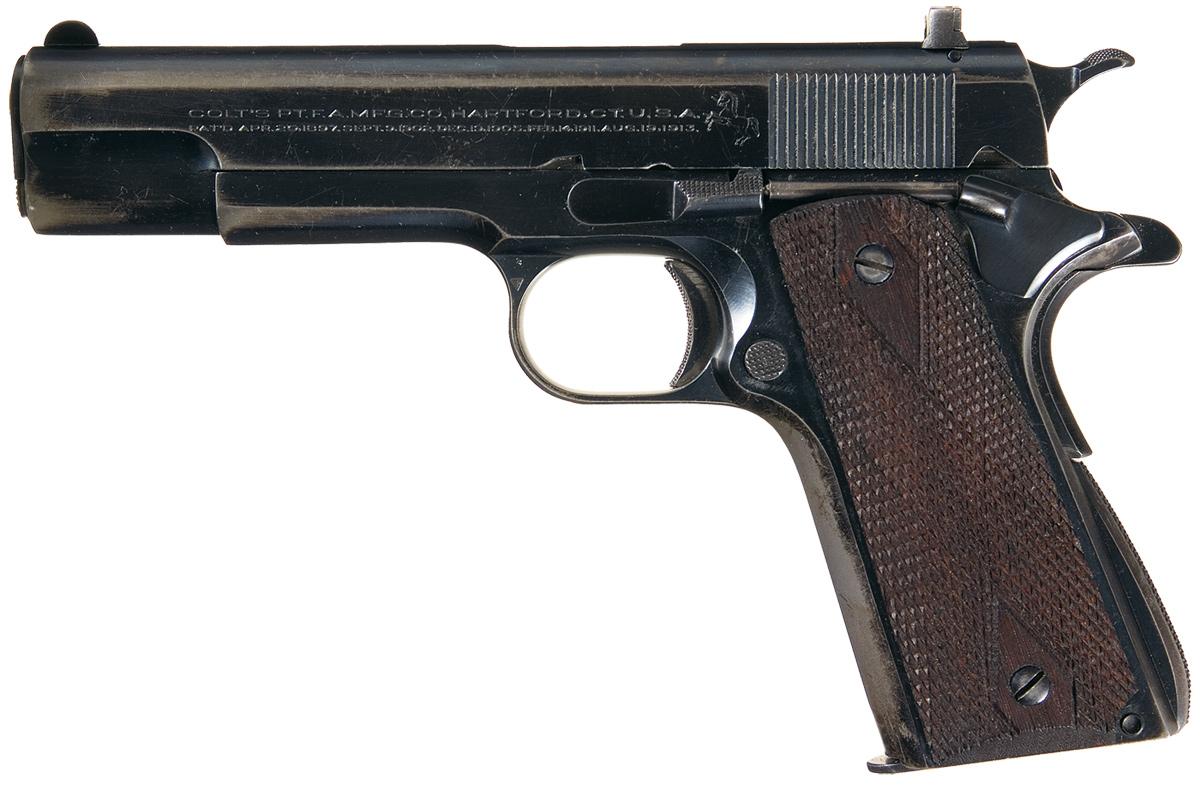 Manufactured in 1931. This pistol features a blade front and an adjustable notch rear sight. The left side of the slide is marked with the two line address / patent dates followed by the Rampant Colt. The standard model and caliber markings on the right side of the slide. The arched mainspring housing, trigger, wide spur hammer, slide catch, and thumb safety are checkered. Fitted with checkered walnut grips with diamond pattern around the screws and a Colt Ace marked two tone magazine.