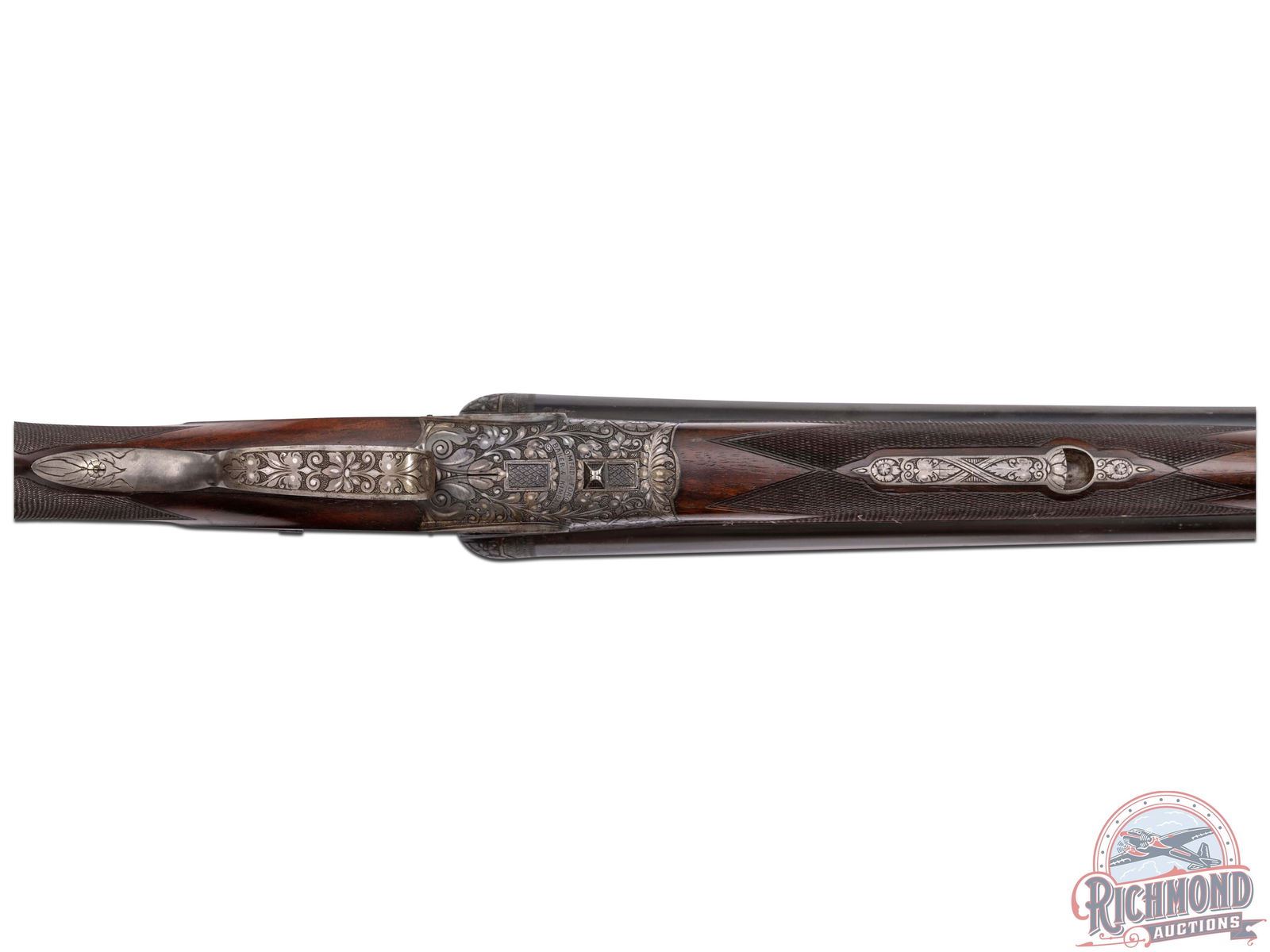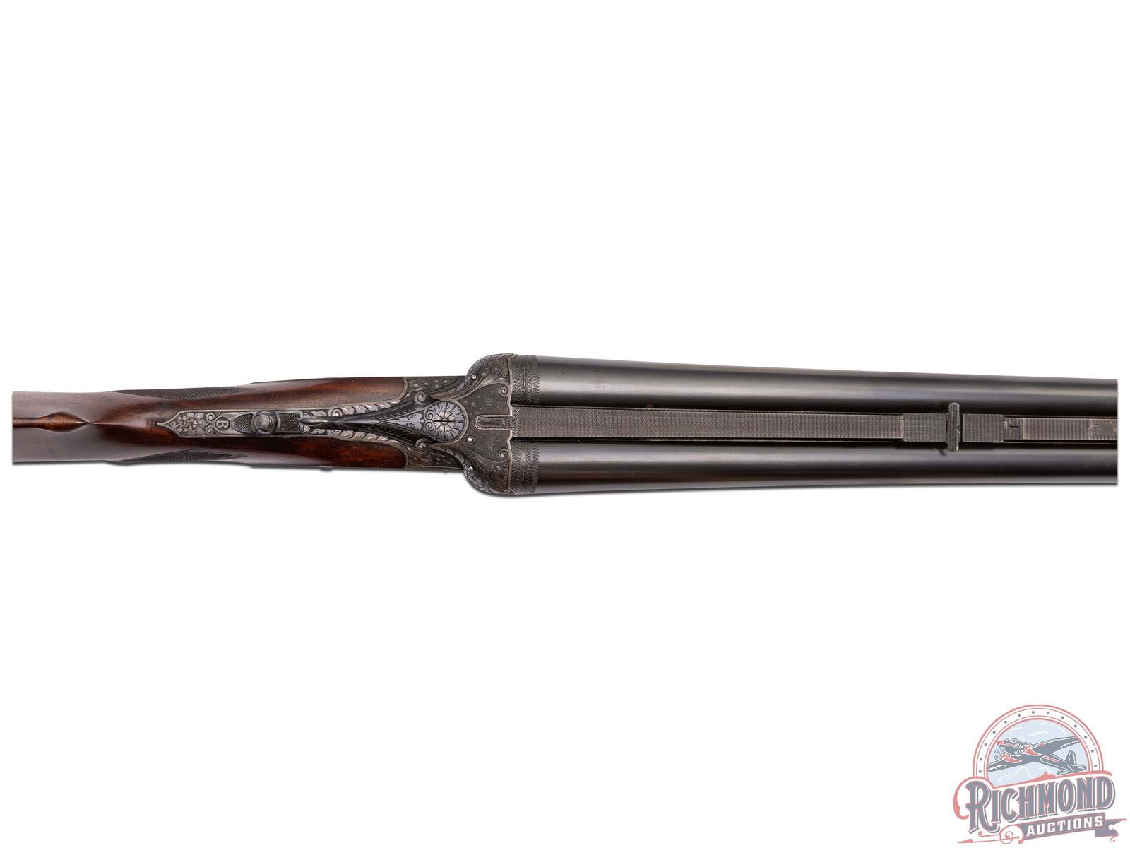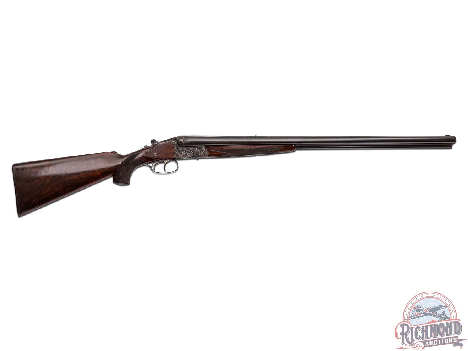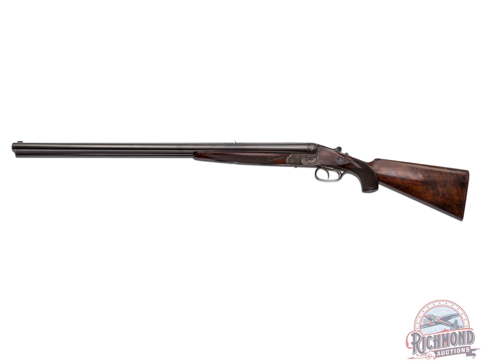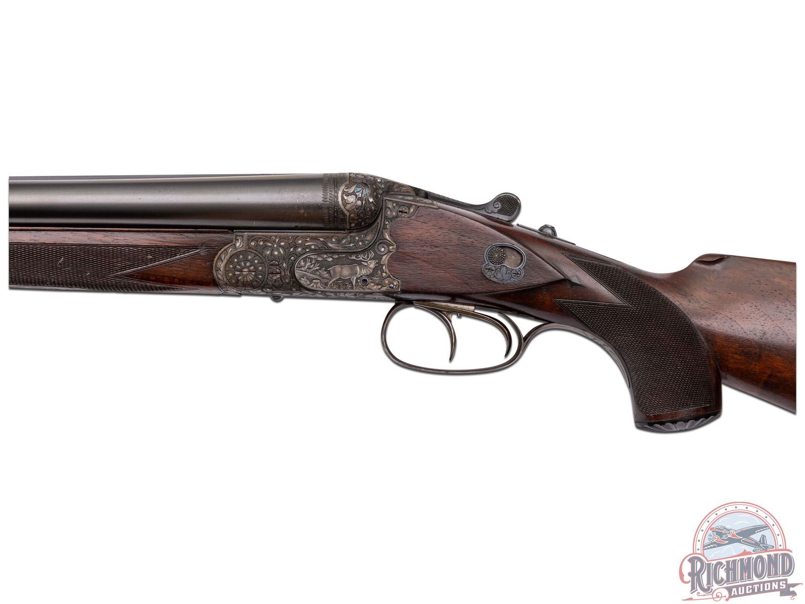 Made in Suhl, Germany by Christopher Funk in 1924. 28" blued Krupp steel barrels with matted maker marked rib, rifle sights, ejectors, and Nitro Proofs. Barrels are 12 gauge side by side with 2-1/2" chambers, and Full and Full chokes over 7x57R caliber rifle. Case-hardened floral and game scene engraved scalloped action with side clips, double triggers (front is set), Greener cross bolt and side safety, and top tang barrel selector. Action has floral raybuck scene engraved on right and floral scene on bottom with "MFRD For Baker & Kimball", which is a Boston, Massachusetts Sporting Goods Dealer. The left side has floral scene and bugling hirsch scene. Walnut checkered pistol grip stock with horn butt plate and grip cap with diamond inlay behind locks. Matching walnut checkered splinter forearm with latch release. LOP: 14-1/4". DAC: 1-1/4". DAH: 2-1/4". CALIBER: 12/7x57R. S/N: 35831. FFL STATUS: Curio & Relic.