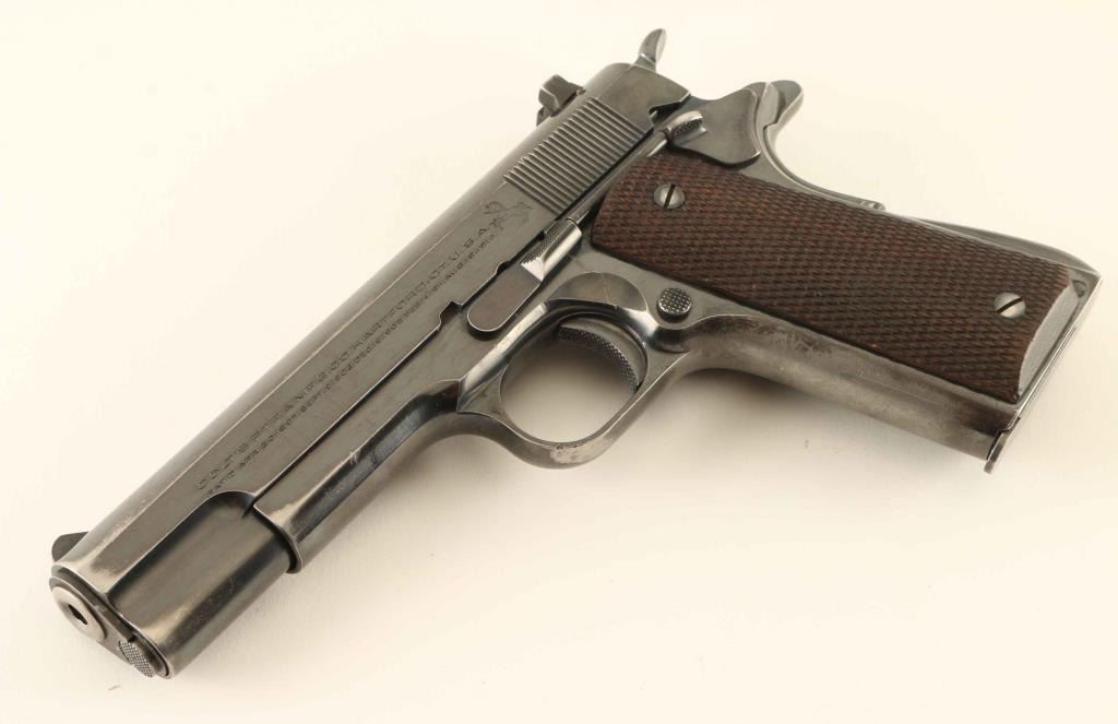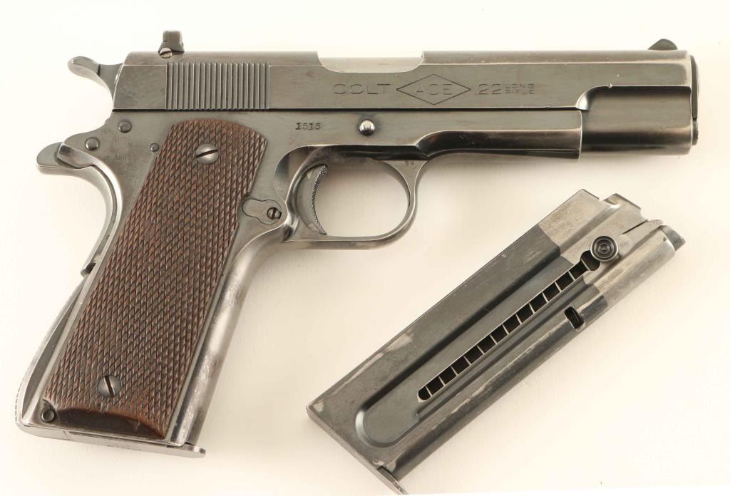 Commercial production single action semi-automatic 1911A1 platform pistol chambered in .22 Long Rifle, manufactured in 1931 - first year production. The Ace model was developed as a training pistol that would duplicate the weight and feel of the standard 1911A1 pistol. Features a bright rust blued finish, 4 3/4" 'full' barrel(does not have a floating chamber), serrated ramp front sight, dovetailed adjustable rear sight, knurled trigger, knurled wide hammer spur, thumb safety on the left side of the frame, grip safety, push button magazine release, factory two-tone magazine, steel frame, knurled arched mainspring housing, and two-piece checkered walnut grips. Includes a factory letter and a spare two-tone magazine. The letter states the pistol was shipped to Union Hardware & Metal Company of Los Angeles, California on August 7, 1931 in a five gun shipment. Pistol exhibits approximately 75% of it's original bright blued finish showing mild holster wear, scattered superficial scratches and heavy finish loss on the grip straps. Action is smooth, the bore is good with some scattered light pitting, markings are sharp and the wood grips are good with semi-worn points & blemishes. Condition is NRA Very Good+. ***C&R Firearm***
