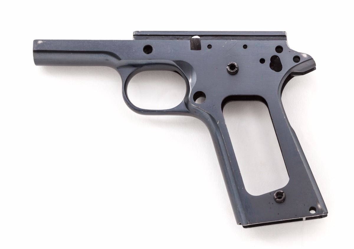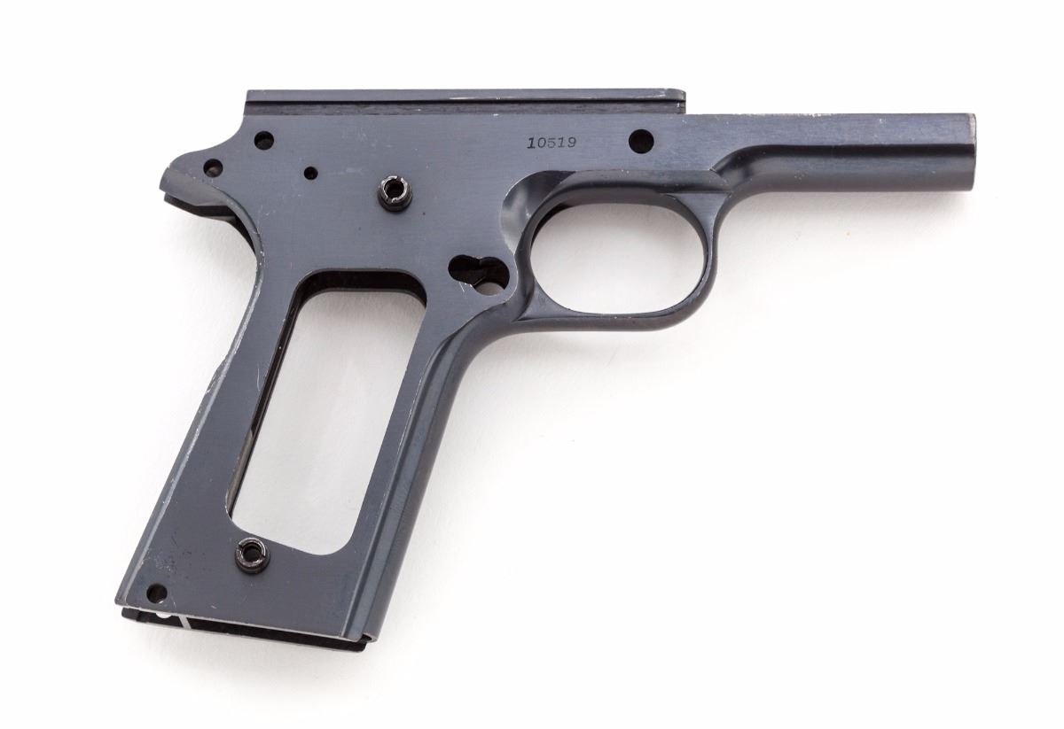 Pre-War Colt Gov't Model Ace Semi-Automatic Pistol Frame, #10519, pre-war carbona blue finish. Originally sold in 2009 during the disbursement of the Colt Archives. Includes factory letter stating under Special Features, ''Receiver only made c. 1941.'' Under Remarks it states ''Subject pistol was a World War II period production receiver for Ace .22 pistol, kept by the Colt Factory.'' Condition is excellent showing light marks from handling and minor wear to front edge. Very similar to a pre-war Super 38 frame. Could easily be made into a working example with the full balance of parts needed. Est.: $2,000-$3,000. (C&R)