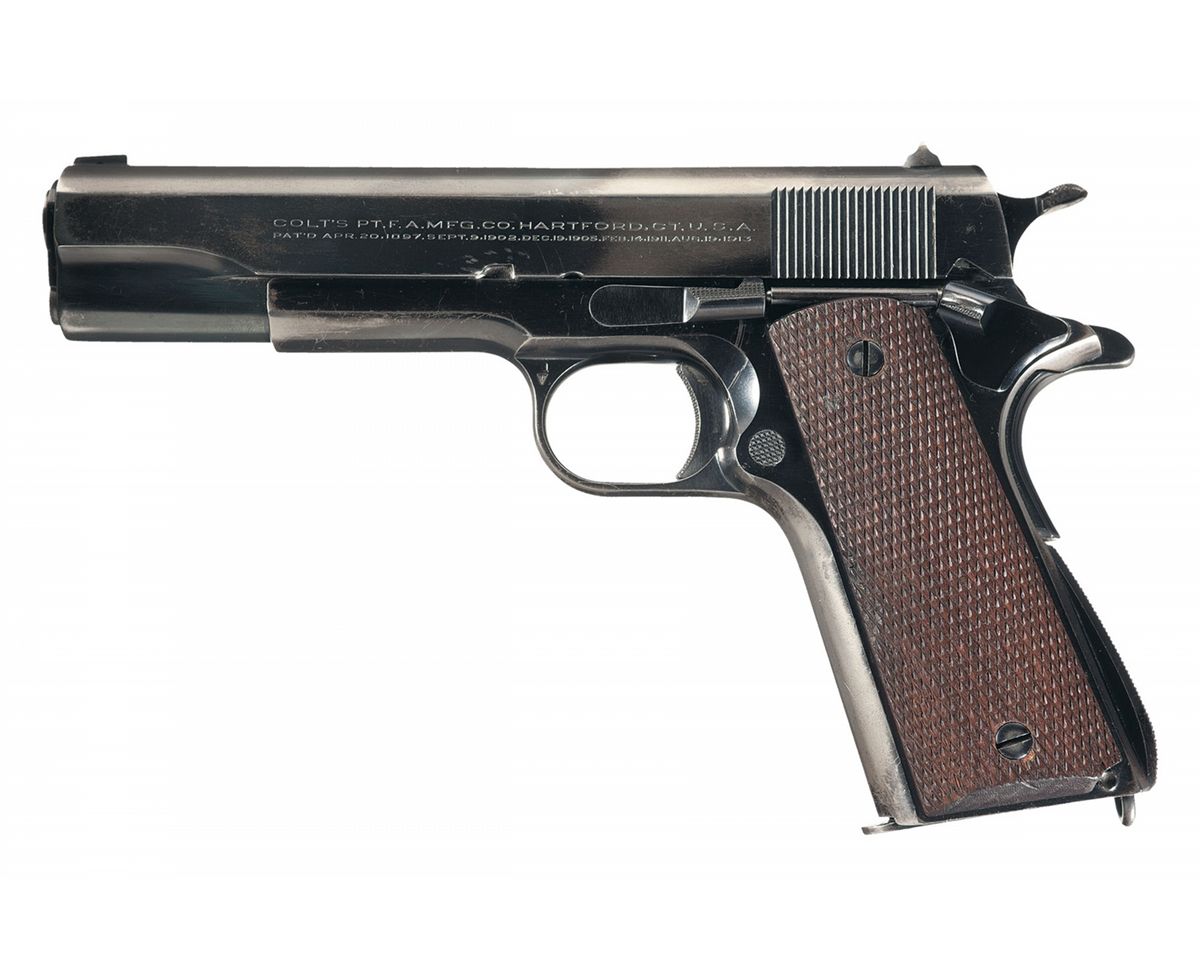 Condition: Very fine as partially refinished (slide). The pistol retains 40% original blue finish on the frame with the balance a smooth gray patina. The grips are fine with a few minor handling marks and overall crisp checkering. Mechanically excellent.