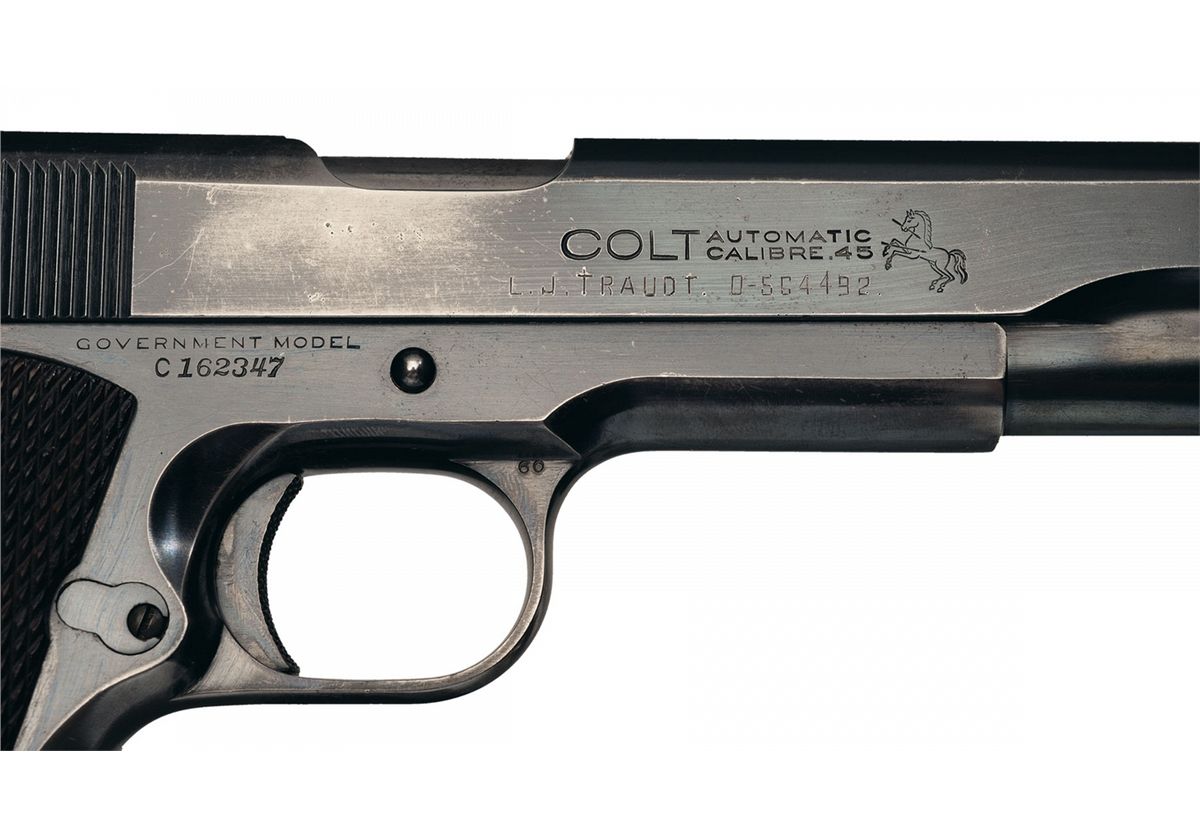 Manufactured in 1932. Left side of slide has the two line address/patent dates marking and the right side has the caliber marking with the Rampant Colt along with a hand marked "L.J. TRAUDT. 0-564492." Right side of frame has the model/serial number marking. Trigger guard is marked "1/factory triangle proof" and "60". Has an all blue unmarked magazine.