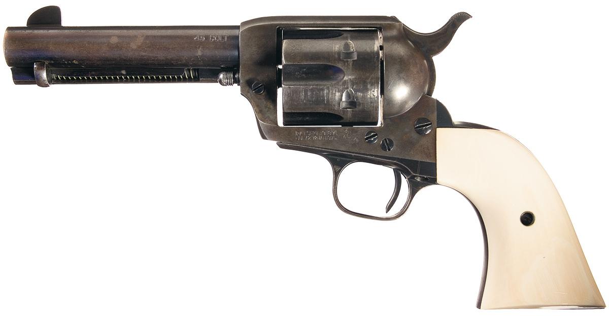 Made in 1921. Fixed sights, with the two-line Hartford address on top of the barrel, "45 COLT" on the left, and the two-line, three patent date markings along with the un-circled Rampant Colt on the left side of the smokeless powder frame. The trigger guard is marked "3/ VP" on the left with the upside down "&" factory re-work mark on the right near bow. Numbered "28" on the rear of the cylinder, with "154" on the loading gate. Smooth two piece ivory grips.