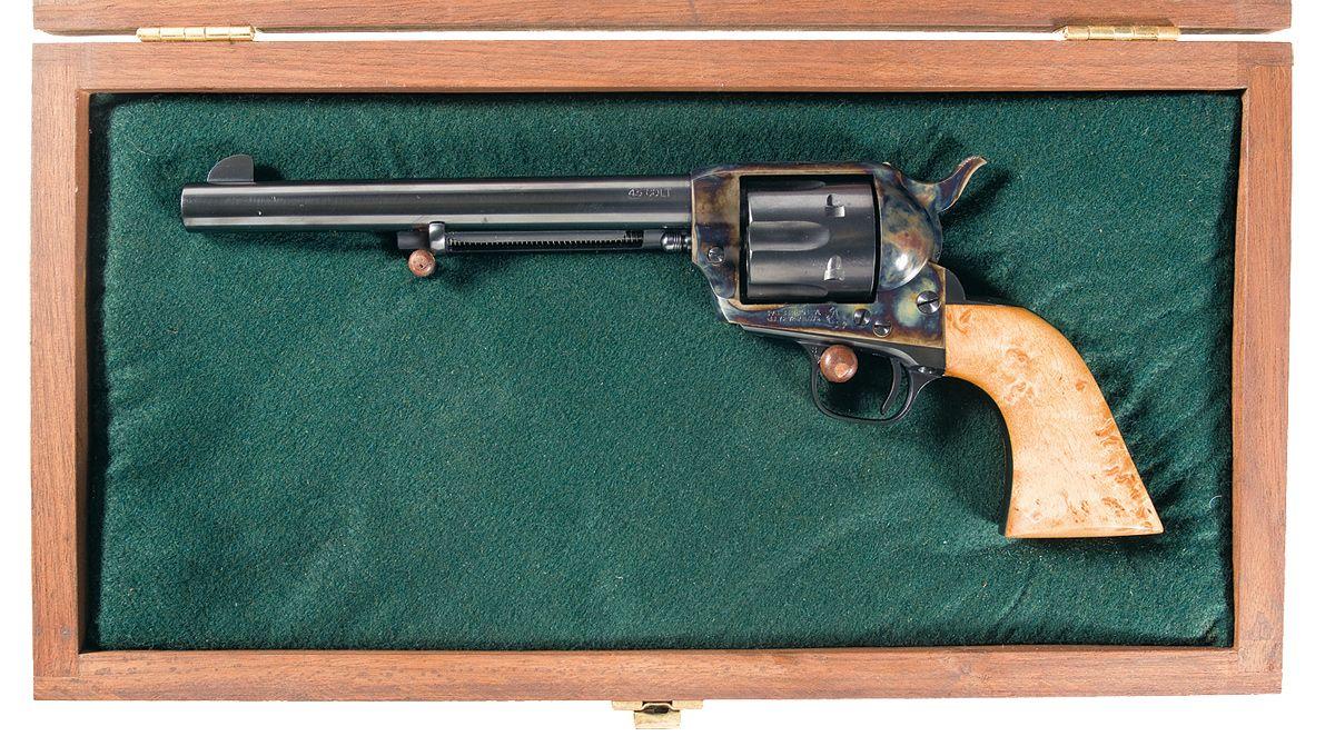 Manufactured in 1923, with standard markings and features. The revolver is reportedly a Turnbull Custom refinished gun, and is fitted with a custom bird's eye maple one-piece grip. Complete with a glass top, wooden display case with a dark green interior, wood pegs and hanging notches in the rear.