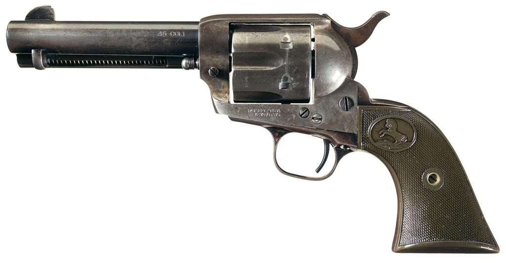 Manufactured in 1926. The top of the barrel is marked with the two-line address, "45 COLT" on the left side and the left side of the frame is marked with the two-line, three patent dates followed by the Rampant Colt. The matching serial number is marked on the bottom of the frame and on the right side of the front and back strap under the grip. The rear face of the cylinder is stamped with the last two numbers of the serial number, "69". The loading gate and right rear of the frame are marked with the assembly number "454". Blade front and frame notch rear sights, blue finish with casehardened frame and hammer, and fitted with hard rubber grips with the Rampant Colt in an oval at the top. The inside of the left panel has a name and number scratched into it.