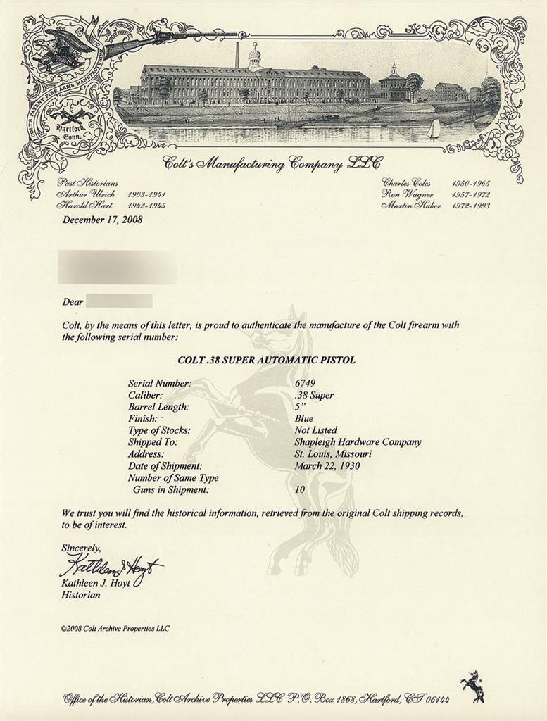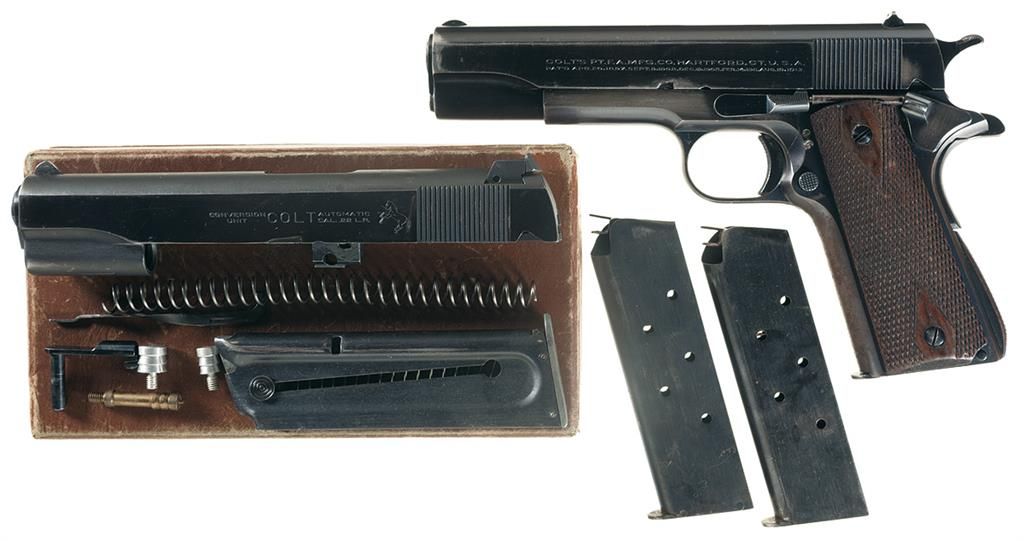 Manufactured in 1930 with 2 extra magazines. The Colt Conversion Kit with Service Ace-style slide assembly, a gold labeled brown leatherette box and a Colt factory letter which verifies the major features and lists shipment to Shapleigh Hardware of St. Louis, Missouri on 22 March 1930.