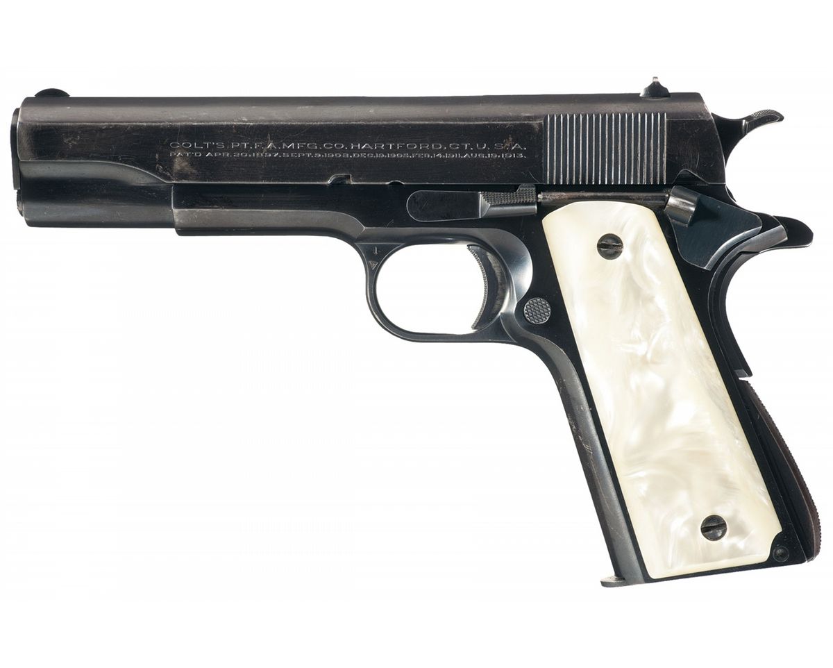 Fixed sights, with the two line address and patent dates on the left side of the slide and the caliber markings on the right. A matching serial number is stamped around the firing pin hole, with "S" on top of the frame, short milled trigger, arched checkered mainspring housing and smooth grips. Included with the pistol is a brown leather Lawrence holster, #572, a U.S. Milwaukee Saddlery 1946 magazine pouch, and two 45 ACP magazines.