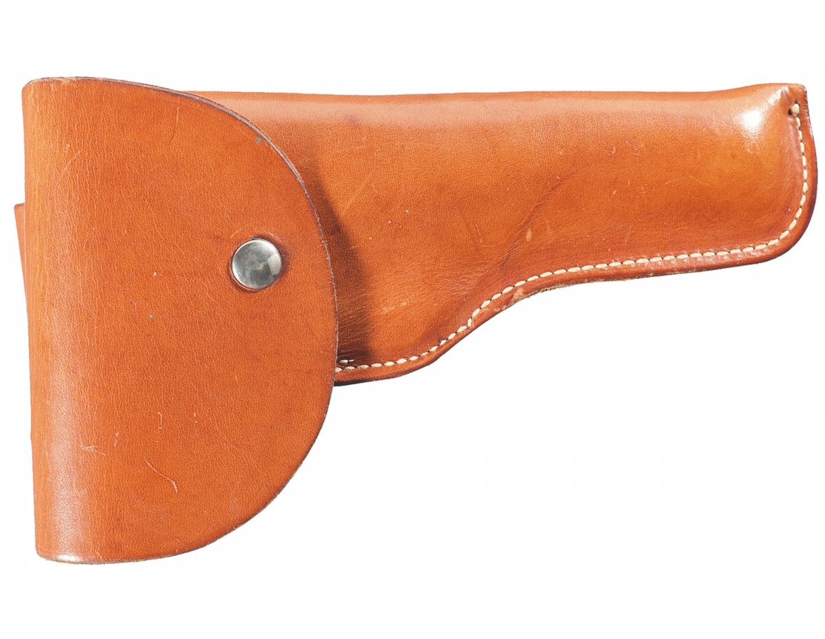Condition: Very fine, with 90% plus of the original blue finish, showing areas of cold blue touch up, bright edge wear. Grips are very good, with minor handling marks. Verdigris buildup is present on the pouch, along with some minor scuffs and cracks, and the holster is very fine. Mechanically excellent.