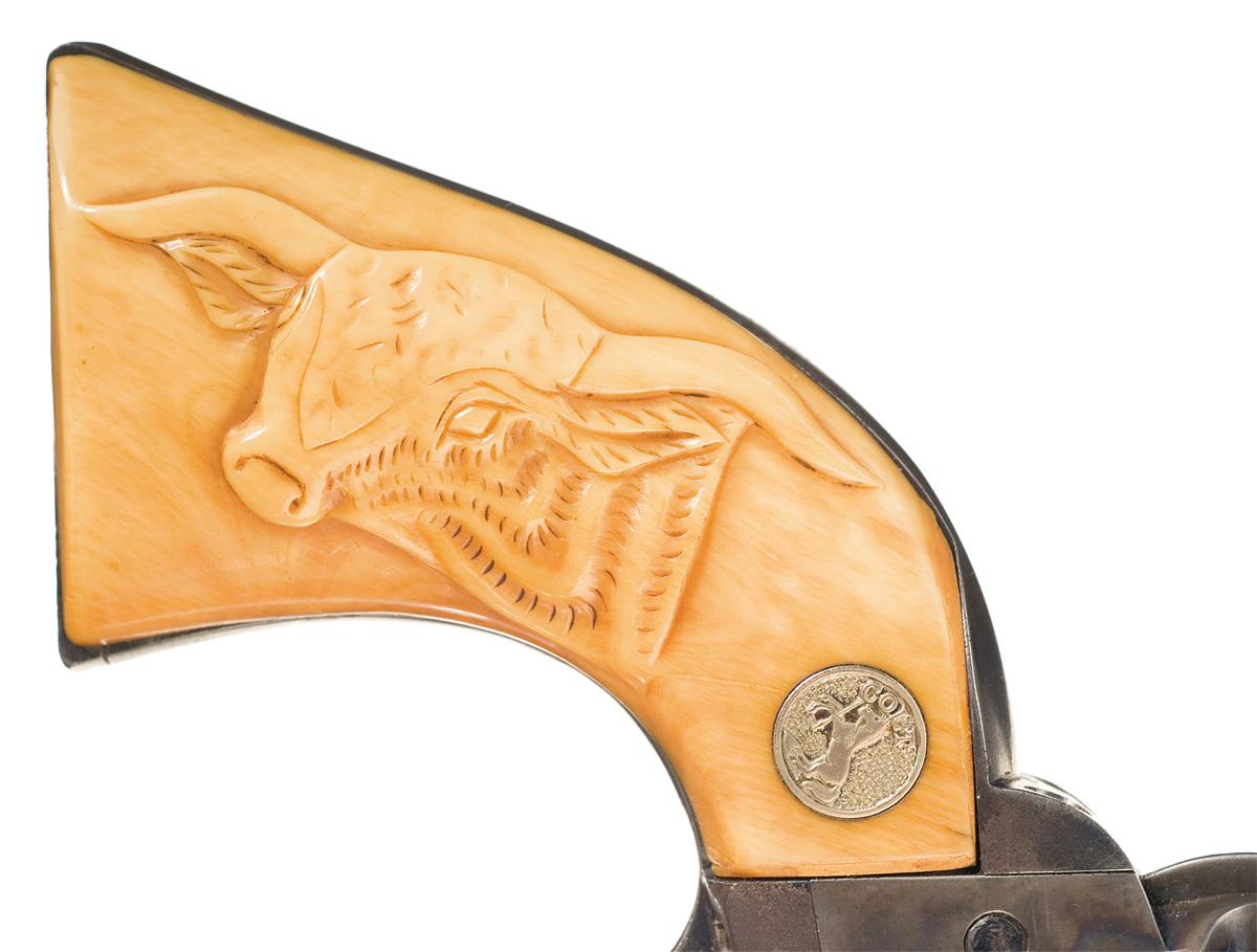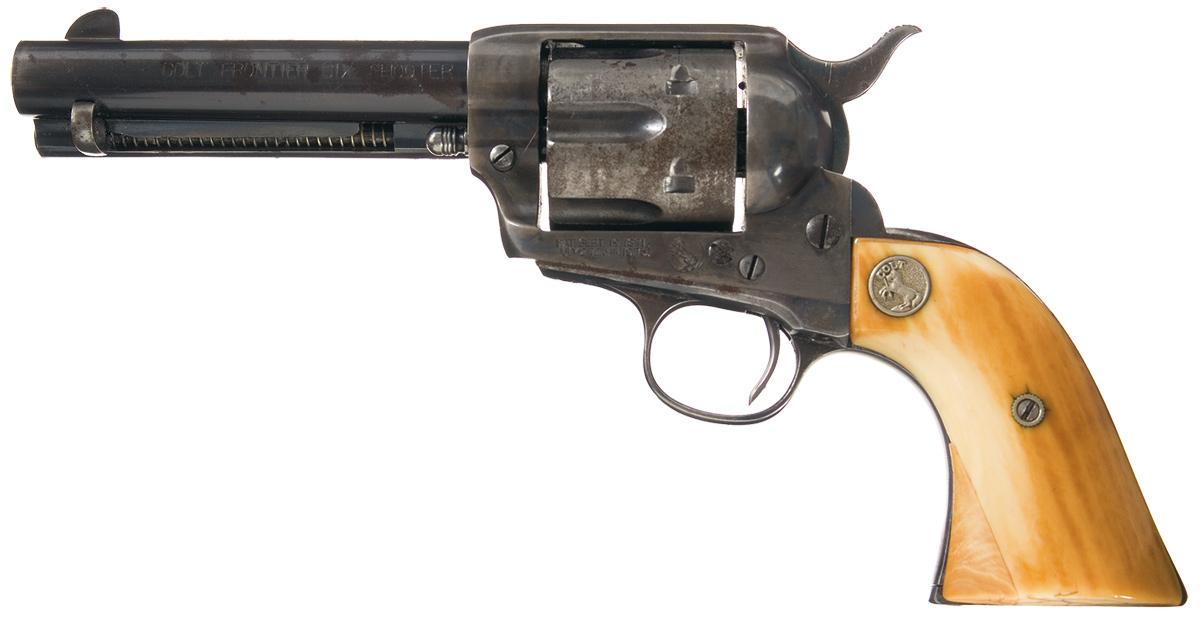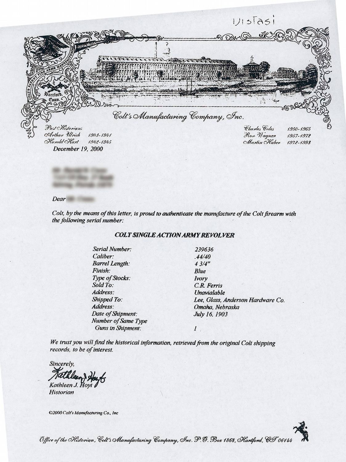Manufactured in 1903. The top of the barrel is marked with the two line Hartford address with "COLT FRONTIER SIX SHOOTER" roll stamped on the left side and "44" on the underside. Smokeless powder frame, with 2-line, 3-date address on the left side followed by the circled Rampant Colt, "W" in the hammer cutout and "2216" on the loading gate. Matching serial number on the frame, trigger guard and backstrap, with matching partial number on the rear cylinder face. Two piece ivory grips with silver Rampant Colt medallions, left panel smooth, right panel decorated with a raised carved steer head. The accompanying factory letter verifies the serial number, caliber, barrel length, blue finish, ivory grips, that it was sold to C.R. Ferris and shipped as 1 to Lee, Glass Anderson Hardware Company, Omaha, Nebraska on July 16, 1903.