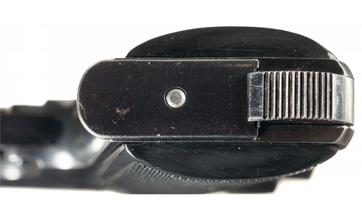 Excellent with 97% plus of the bright original high polish blue finish with wear on the high spots, with slight thinning on the grip straps. The grips are also in excellent condition with nice distinct markings and checkering on both sides. Mechanically excellent. The slide has the matching etched serial number on the inside.