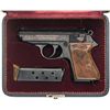 This is an example of a pre-WWII Walther PPK semi-automatic pistol that was subsequently custom engraved and cased. The pistol has been engraved in a floral (Edelweiss) and vine type engraving pattern mixed with a punch dot back ground. The serial number is stamped on the right side of the frame with the last three digits "192" correctly scratched on the inside of the slide. The Walther Banner/slide legend has been framed in a circular border with the noted engraving pattern covering the remaining surfaces of the slide, sides of the frame and front grip strap. The right side of the chamber and slide have the early "Crown N" proofmarks. The metal surfaces have an all blue finish. The slide is fitted with the standard sights and 60 degree safety. It is complete with two Walther Banner marked magazines, one with the flat base plate and the spare with the matching brown finger extension. It has the original early production mottled brown plastic checkered grips with the reinforced metal strap on the back sides. The pistol and spare magazine are all housed in a post-war Walther commercial production presentation case. The inside of the case has the red velvet interior with the blue leather outer cover. Inside the lid of the case it is marked "WALTHER".