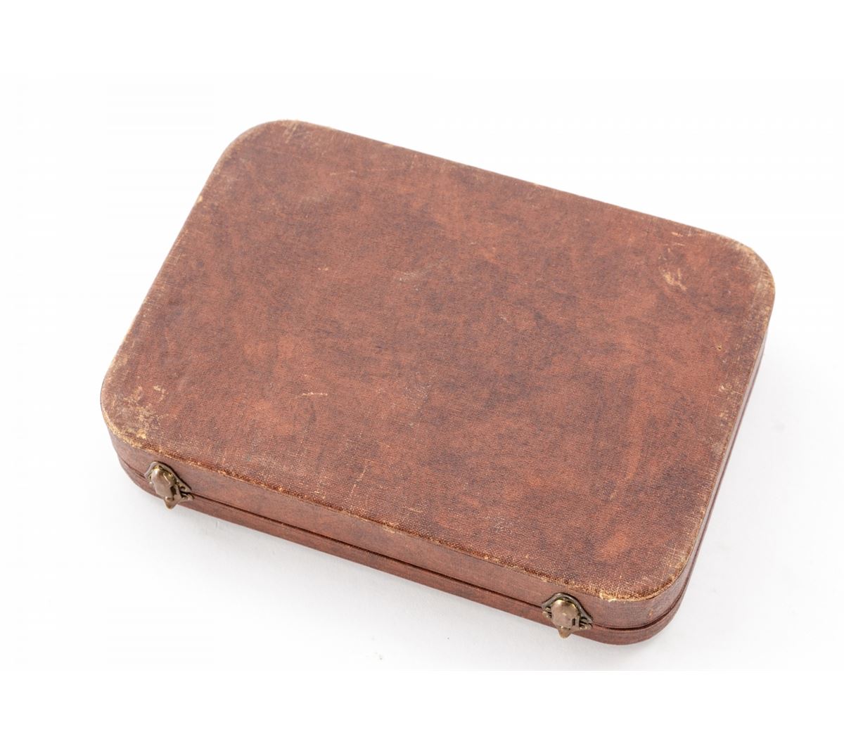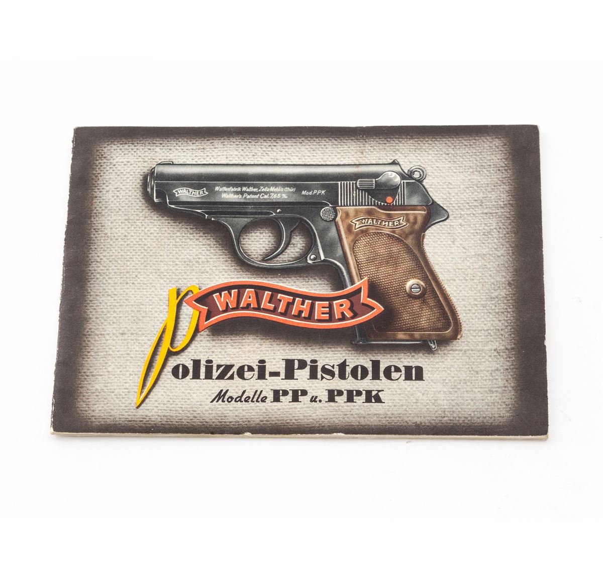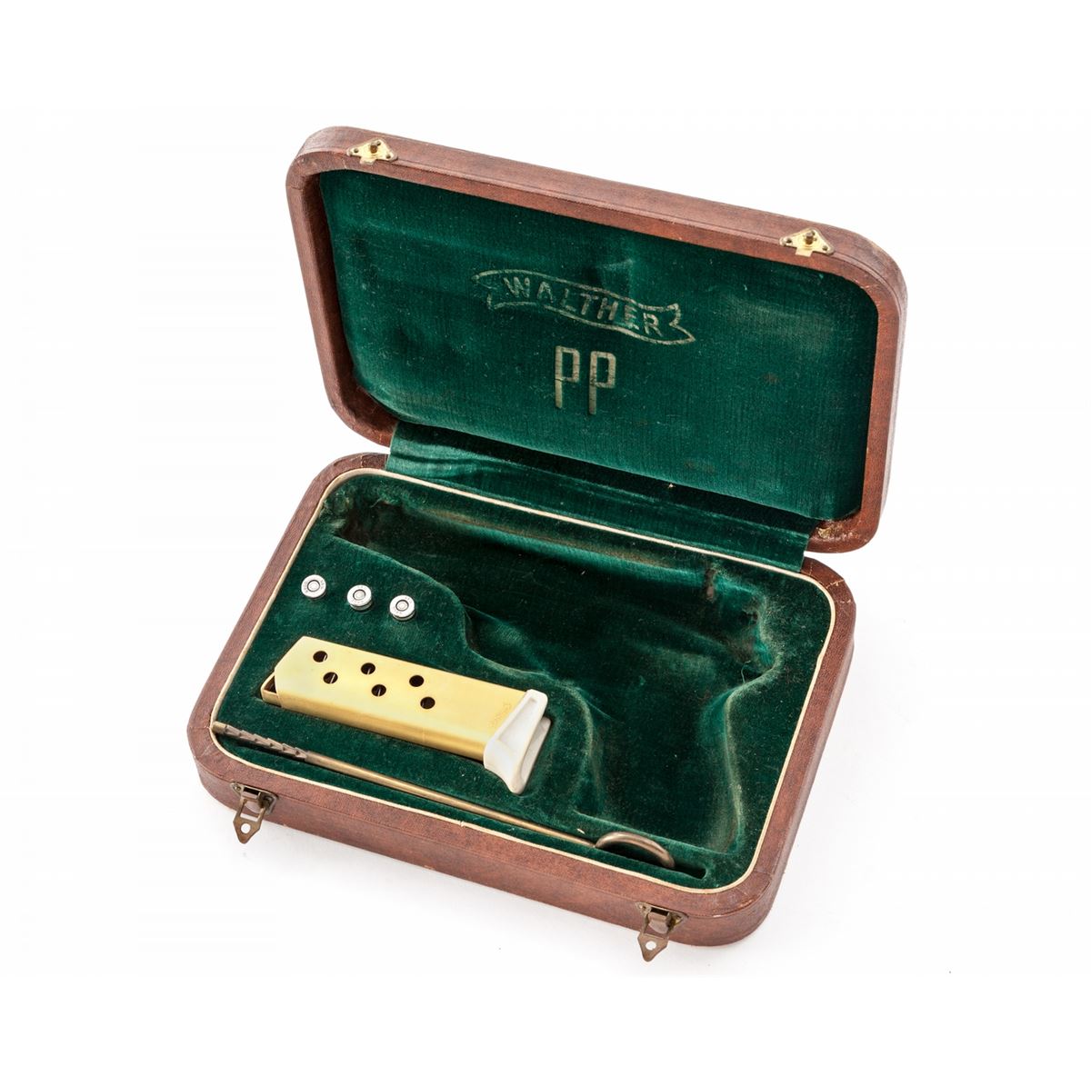 Pre-War Walther PP Presentation Case, with gold-plated white based .32 cal. magazine, cleaning rod, and one period instruction booklet. Exterior covered in brown faux leather; interior is green velvet lined. Condition is excellent with some soiling and minor wear-thru inside of area that pistol covers. A great often missing accessory for the pre-war presentation PP pistol. Est.: $400-$600.