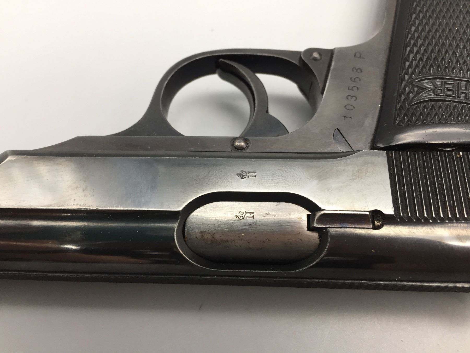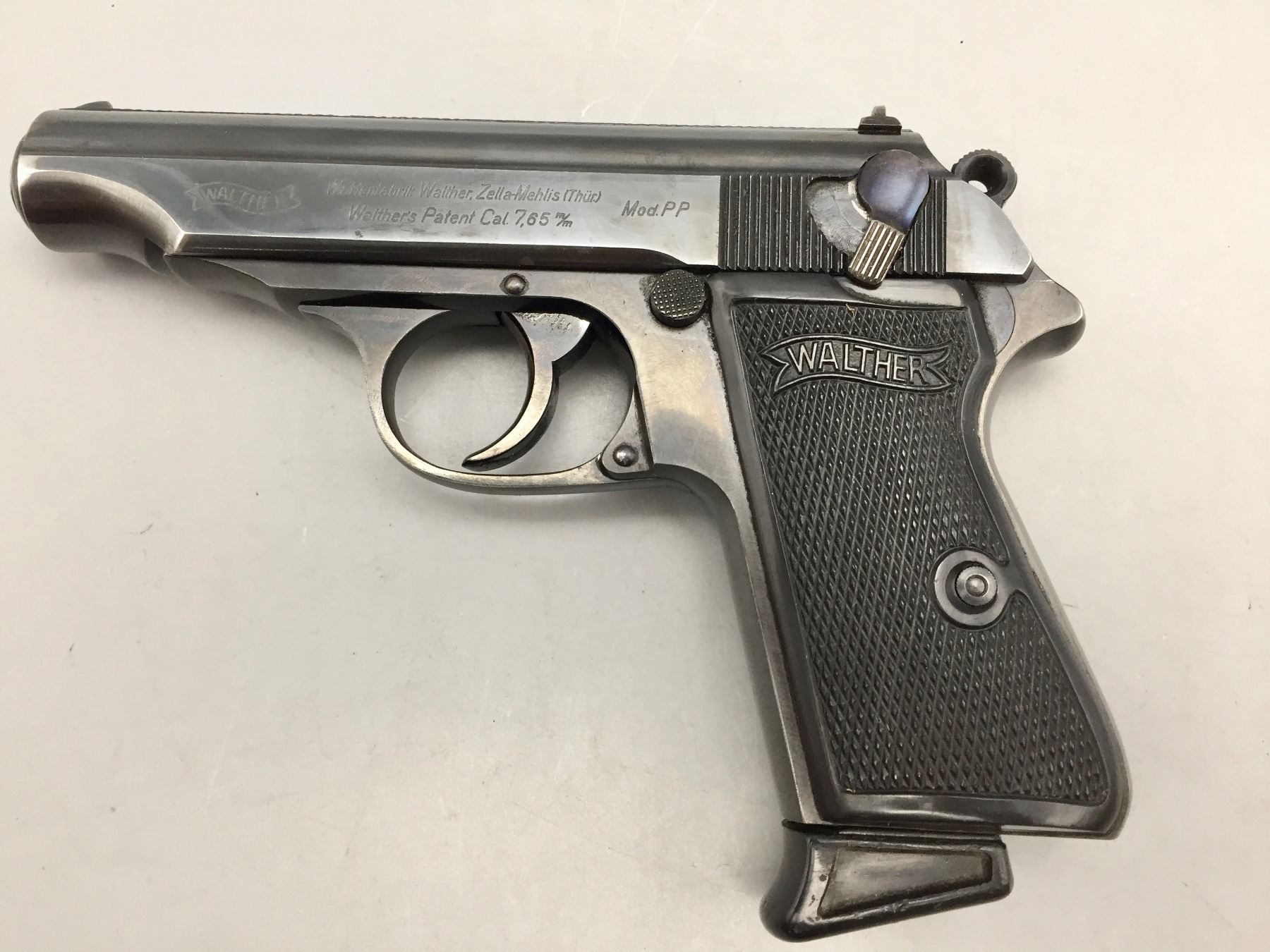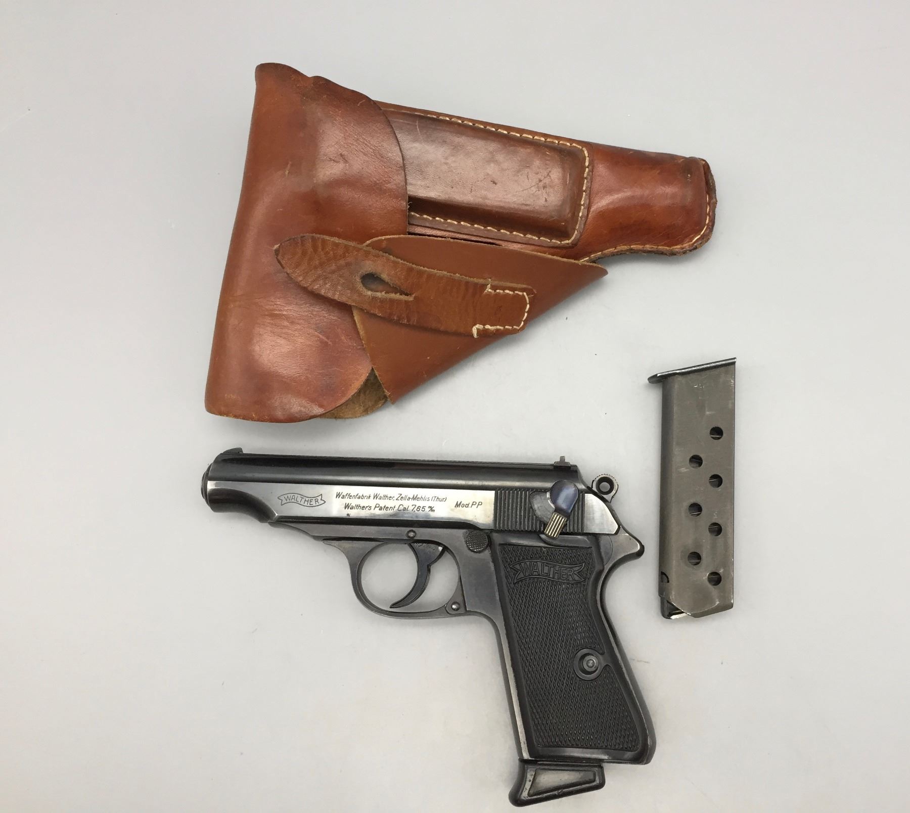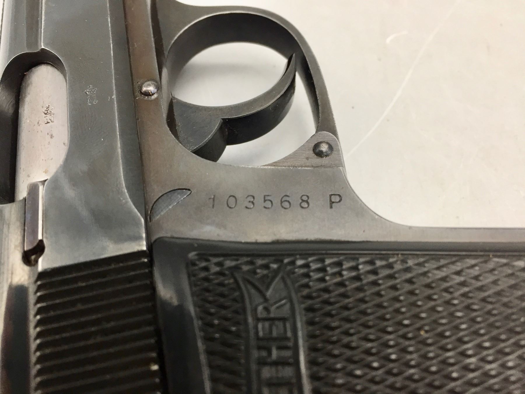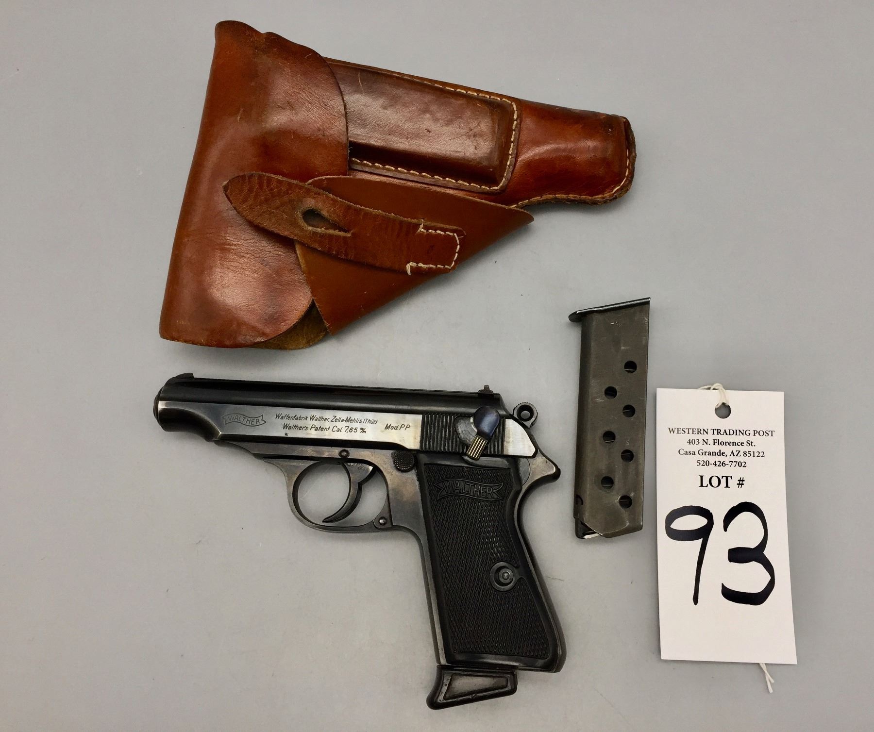 Description: Featured for sale in this lot is a Walther PP, 7.65 caliber pistol with blued steel finish and original, hard rubber, checkered grips and also includes a leather holster with an extra clip. This is a pre-war Walther. Maker: Walther. Approx. Age: Circa late 1930s based on serial # 103568. Size: Standard for this model. 7.65 (.32 auto) Cal.. Condition: Very good for its age, minor wear expected. Retains much of its original finish. Please look closely at the pictures - they are an important part of our description. Shipping: There will be a $10 handling / packaging fee for shipping this lot. The actual cost of postage will be added on top of that. *****This firearm requires an FFL Transfer*****