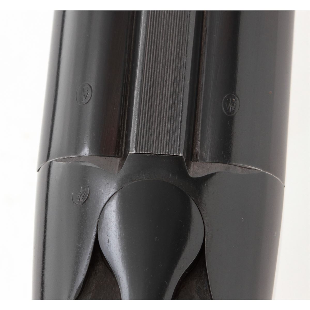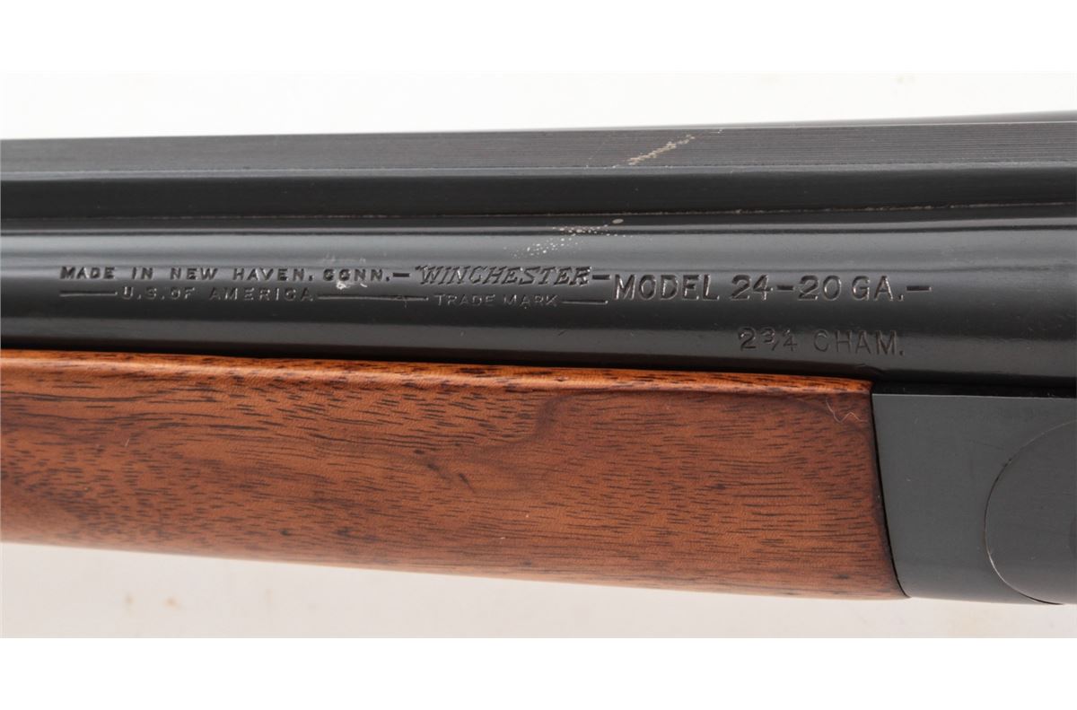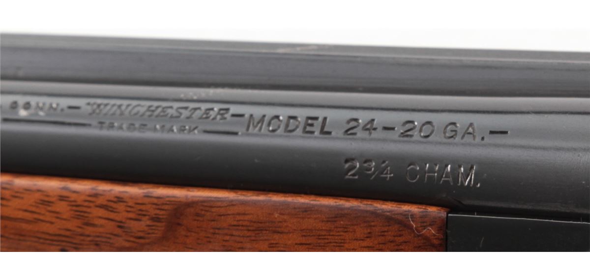 Pre-War Winchester Model 24 Side-by-Side Shotgun, #27237, 20 ga., 28'' barrels choked M/IC, blue finish, walnut stock, with added Decelerator butt pad. Condition is excellent as refinished retaining approx. 97% blue. Stock has been sanded and re-oiled, with fissure to top of comb from shrinkage. Action is crisp, bores are fine. Est.: $400-$600. (C&R)