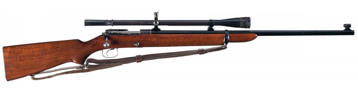 Manufactured in 1934, has a globe front sight and rear sight base mounted in a large dovetail on top of the rear receiver bridge. On the barrel are two scope blocks spaced 7.2 inches apart with a Lyman Targetspot scope. Mounted on a smooth walnut pistol grip stock with sling swivels, silver initial shield on the grip cap area and a checkered steel buttplate with steel spacer. With a leather claw sling.