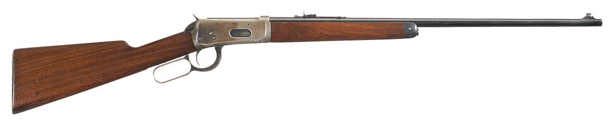 Manufactured in 1934. This rifle features a raised Lyman blade front sight with bead and an adjustable semi buckhorn rear sight. Standard barrel and upper tang markings with factory proofs stamped on the top of the barrel and receiver at the breech. Solid frame with button magazine. Smooth forearm and straight grip stock with serrated shotgun style buttplate.