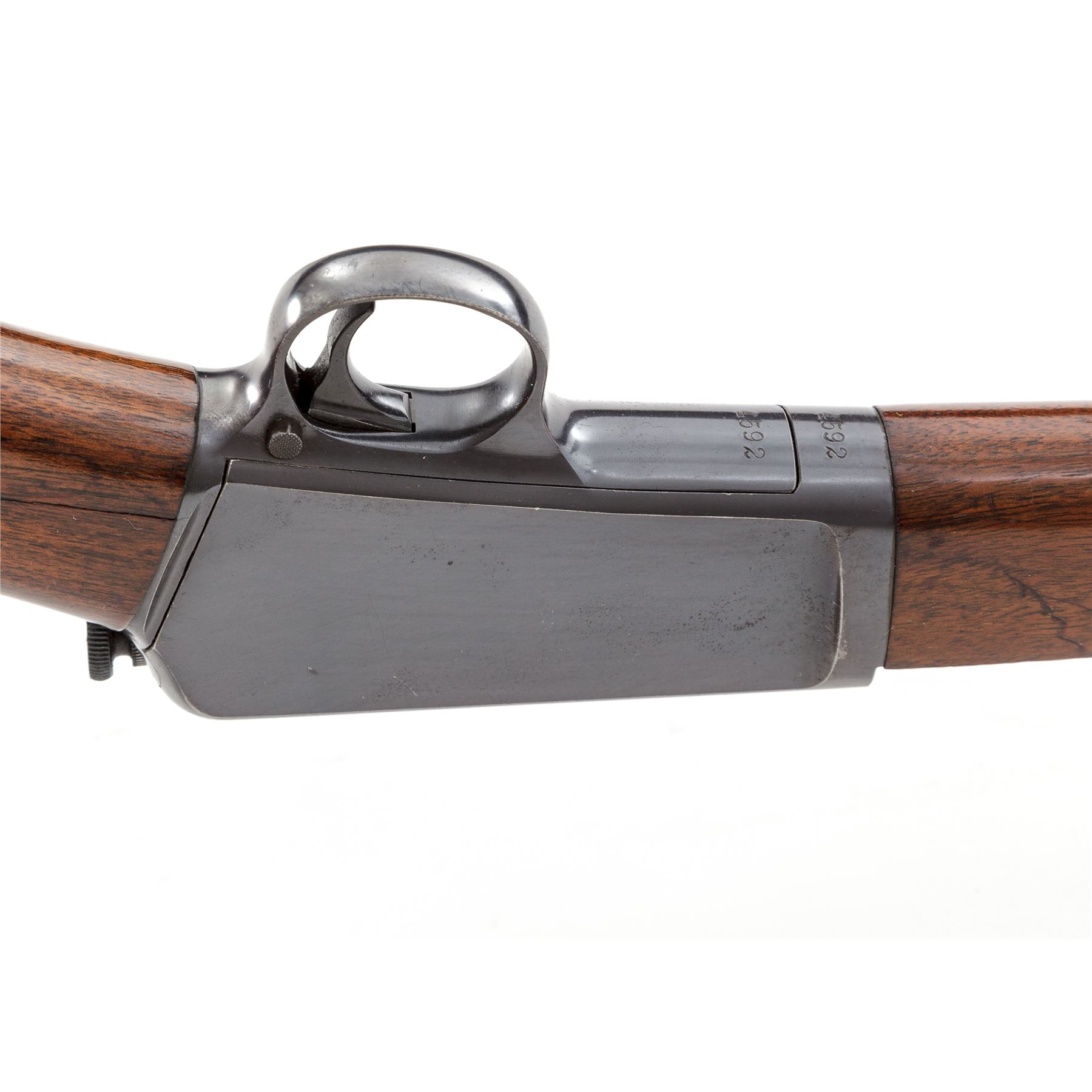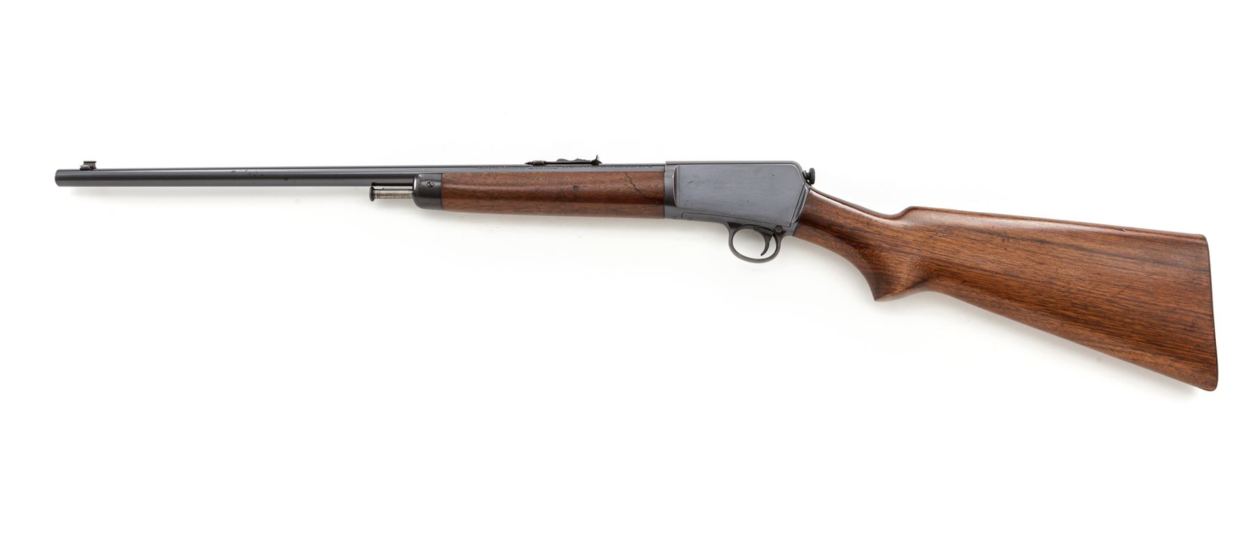Pre-War Winchester Model 63 Semi-Automatic Carbine, #4592, .22 LR cal., 20'' barrel, blue finish, walnut stock and forend. Mfg'd 1934. Condition is near excellent retaining approx. 97% original factory blue, with some light scratches to left side receiver flat. Mild impressions to stock, slightly more pronounced to left side of forend. Good action, mirror bright bore. Est.: $750-$1,000. (C&R)