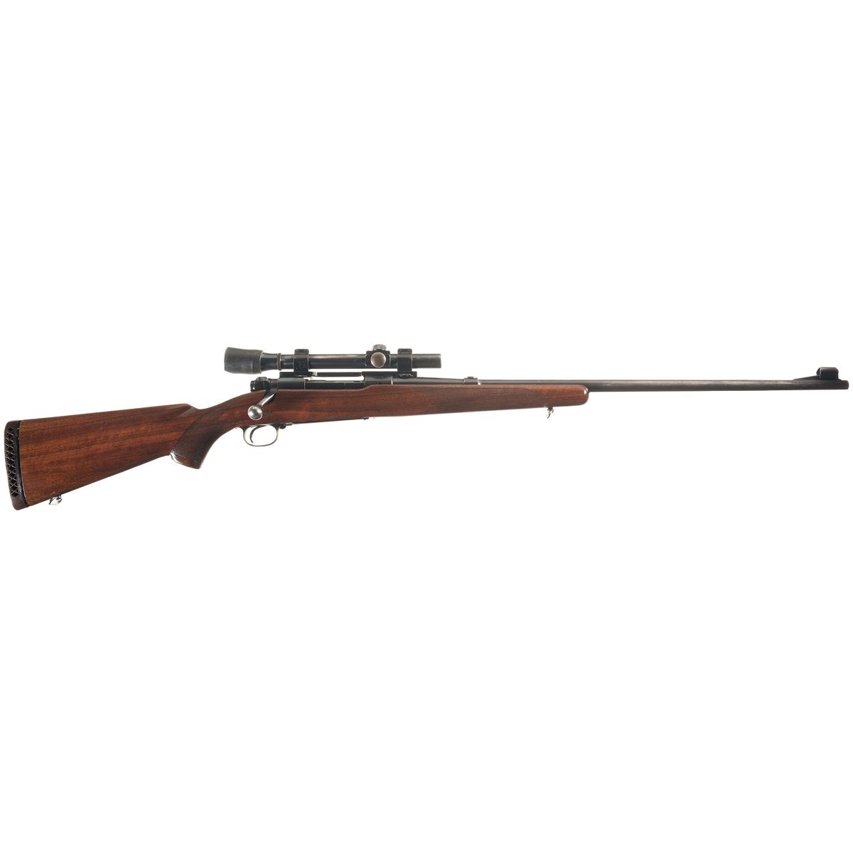 Manufactured in 1942. Redfield filler block in rear sight seat, Pachmayr vented recoil pad, and fitted with a Lyman All-Weather Alaskan scope with rubber eye piece on a Williams rail. Scope is good, with clear optics.