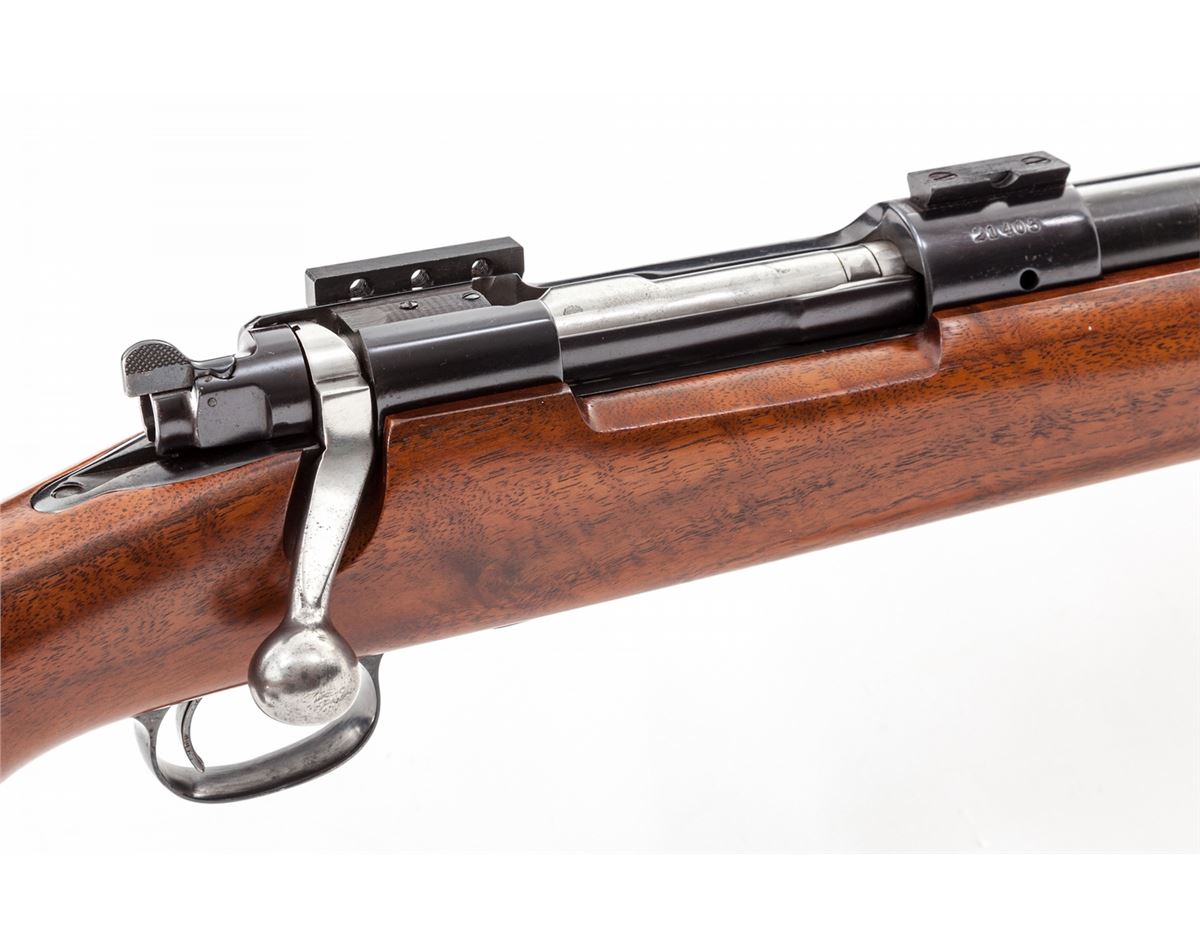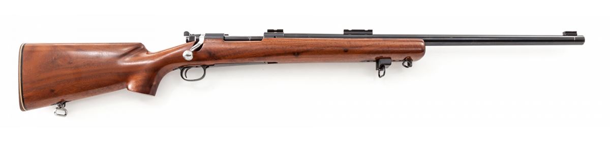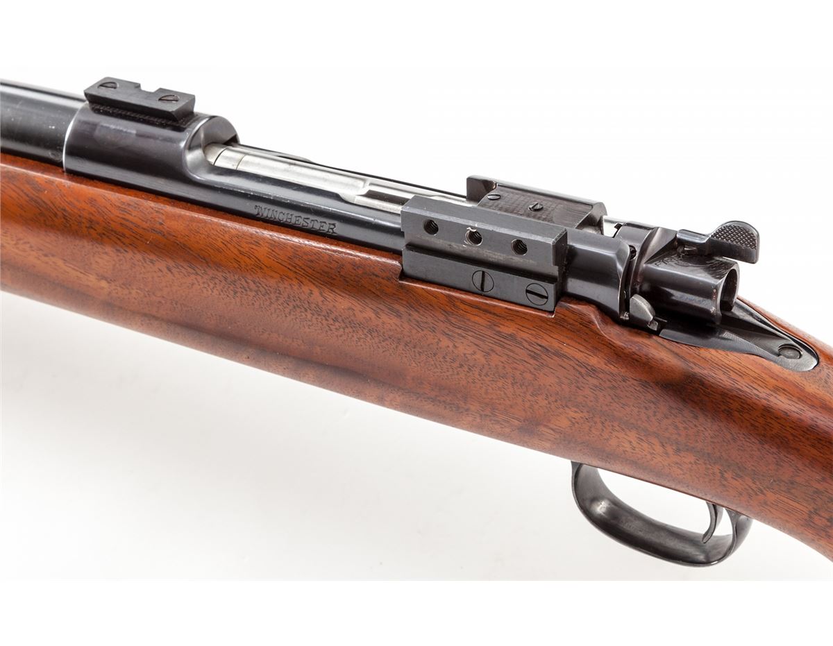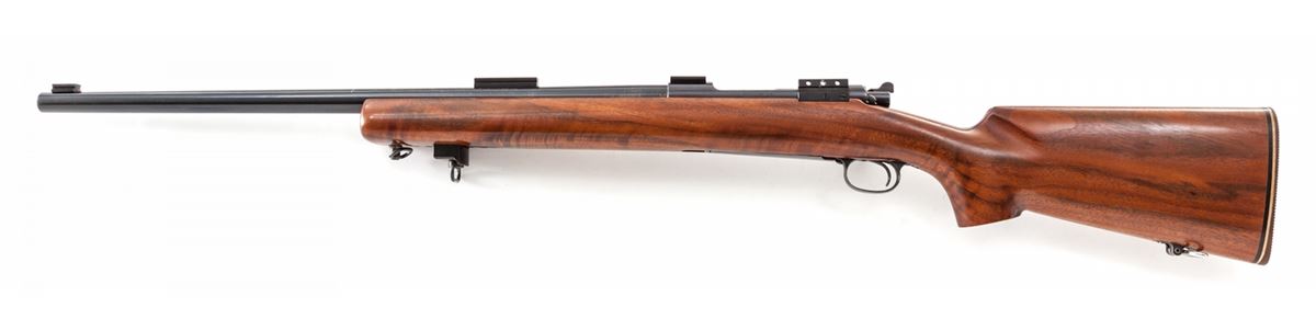 Pre-War Winchester Model 70 Bolt Action Target Rifle, #21405, .30-06 cal., 24'' medium-weight barrel, blue finish, smooth walnut pistol-grip target stock, with Whiteline brown leather pad. Mfg'd 1939. Rifle features dovetail scope mounts, dovetail front sight mount, rail for rear peep sight, five-position handstop and sling swivels. Condition is excellent as refinished, with light scuffs and scratches to magazine floorplate. Stock shows only light marks from range use. Action is crisp, bore is fine. Est.: $600-$800. (C&R)