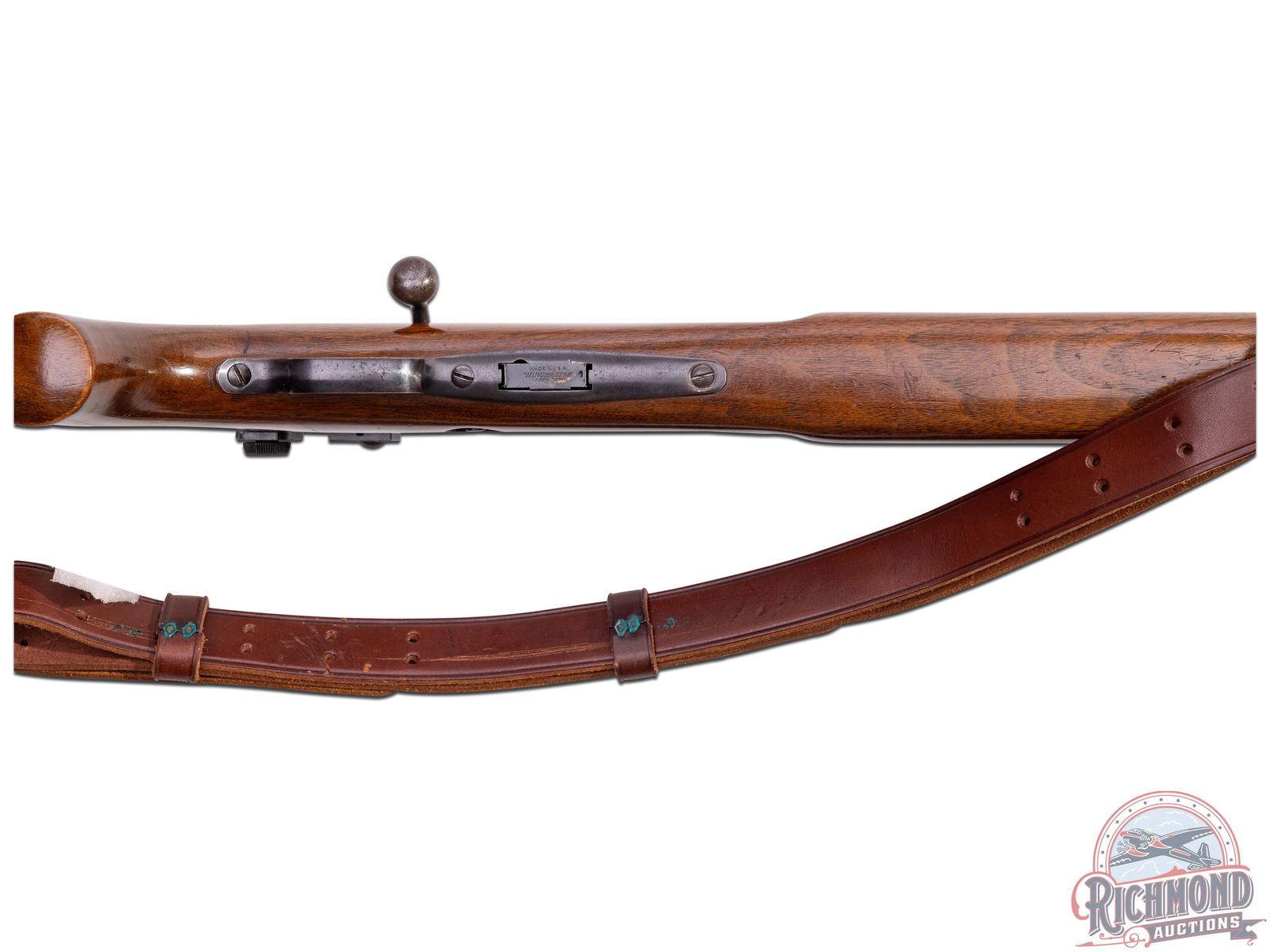 Made by Winchester Repeating Arm in 1940. 28" blued round Target weight barrel in 22 Long Rifle caliber with standard Winchester markings, Lyman Olympic front sight and Lyman peep sight. Blued action with correct Winchester marked detachable magazine. Barrel is fitted with Target block scope bases. Walnut standard plain Markman stock with reproduction leather sling. J.T. Livengood Collection. CALIBER: 22 LR. S/N: 2534. FFL STATUS: Curio & Relic.