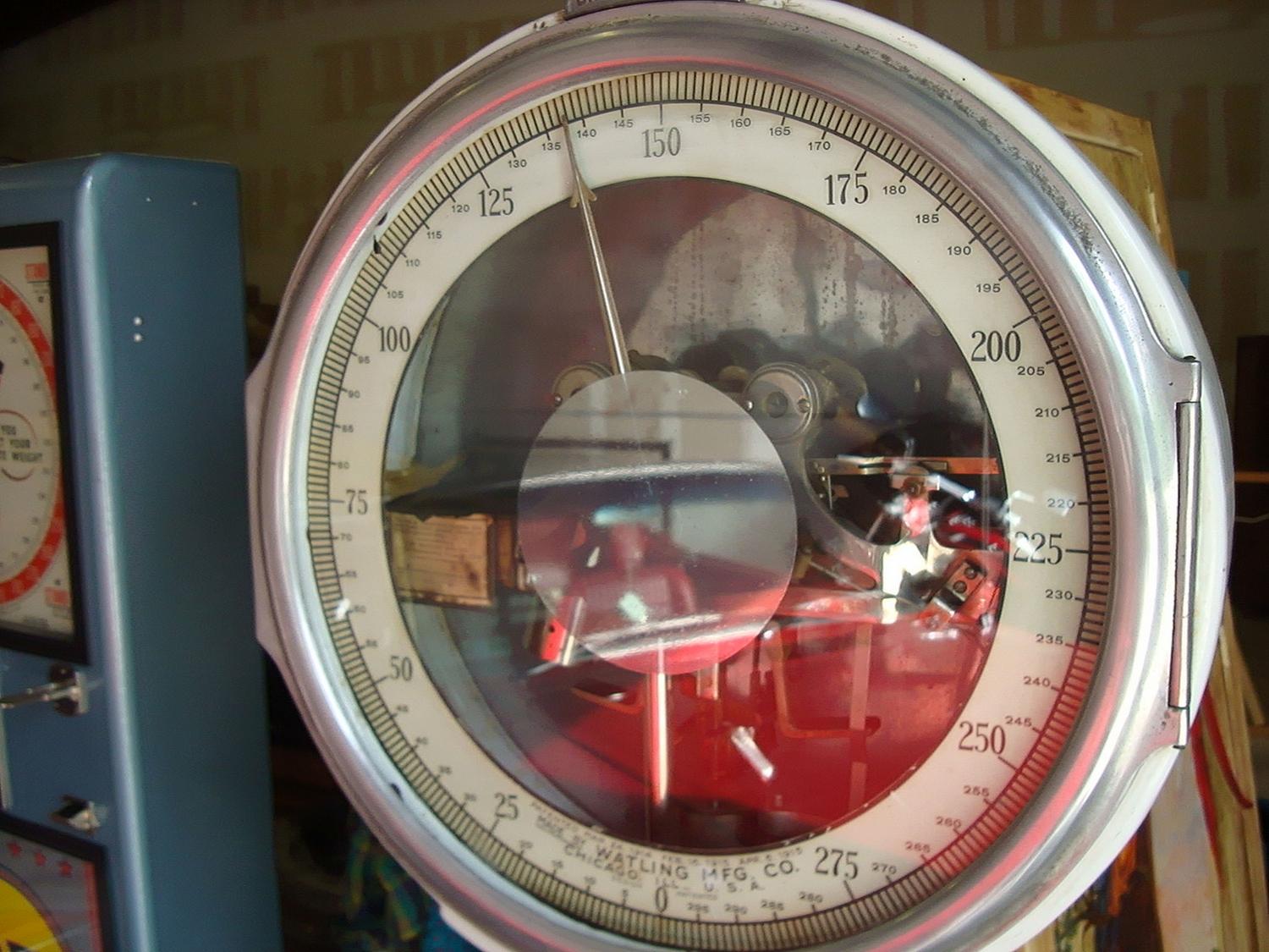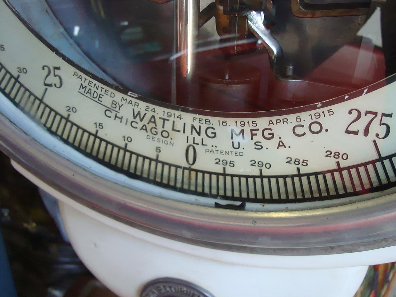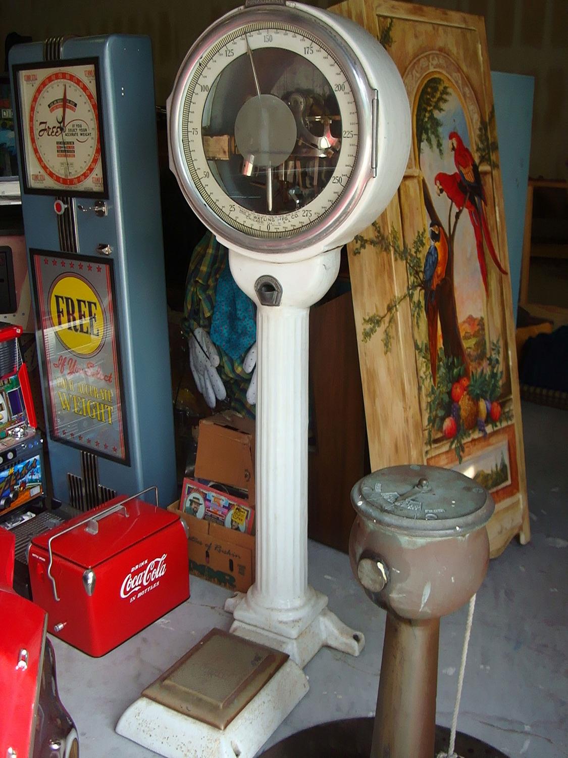 Here's an attractive and lovely fully Watling functional lollipop scale with an eye candy catching face, very attractive cast coin entry. The original porcelain finish is in very good condition. Dimensions: 70" high; 20" Diameter of Head; 24" Depth at the base; 11" x 13" Size of Step. Penny scales have been a staple of cartoon humor almost ever since they were introduced. It's always the same gag -- the machine protests that the person standing on it is too heavy. You'd be surprised how many variations there are on this simple theme. Here's an example