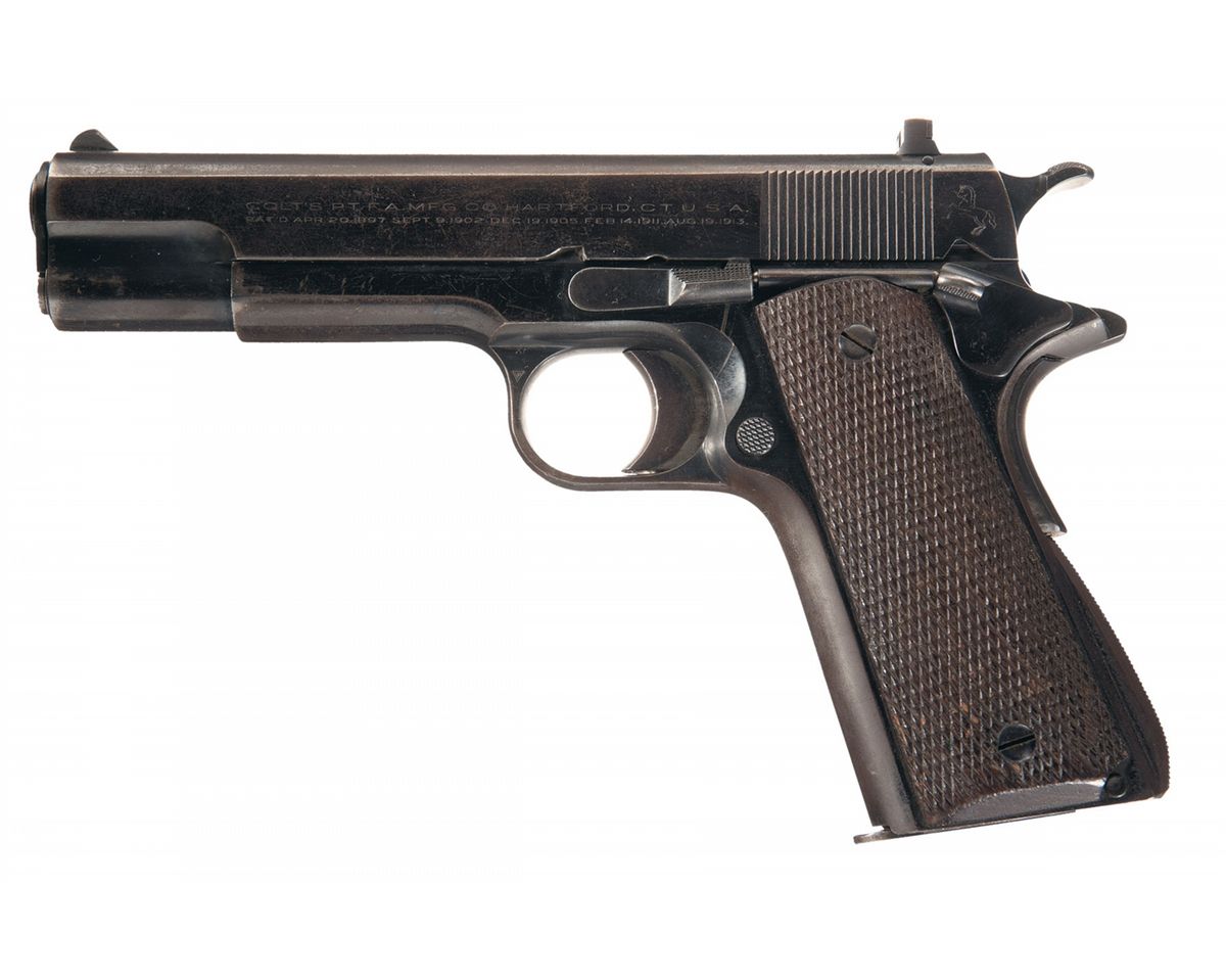 Manufactured in 1937. Blade front and adjustable notch rear sights, with two line address and patent dates on the left side of the slide and model markings on the reverse. Arched mainspring housing, wide hammer, slide catch and thumb safety are all checkered, with a smooth trigger. Checkered grips, with standard markings on the two-tone magazine.