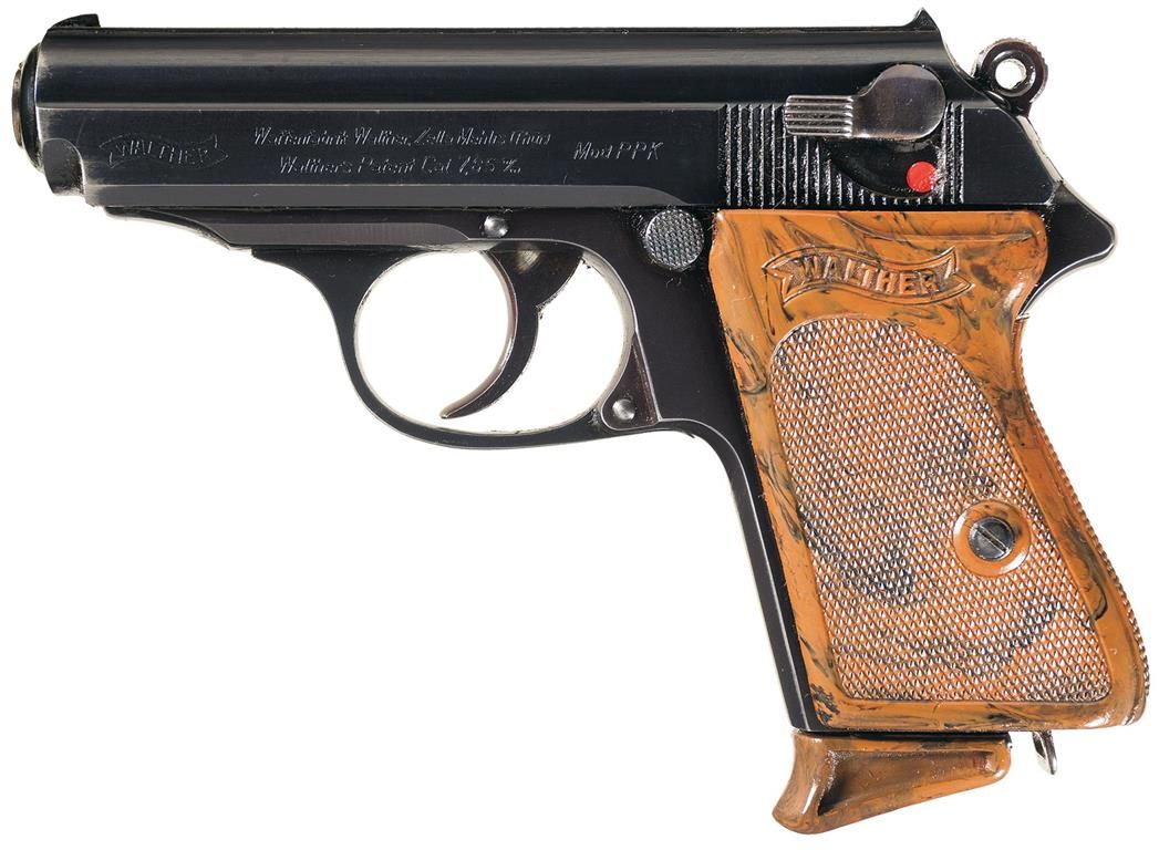 Fixed sights, with the Walther banner, 2-line address and patent dates, and "Mod. PPK" on the left side of the slide, "crown/N" proofs on the slide, chamber and muzzle, and the proper hand-marked partial serial number inside the slide. Fitted with a 90 degree safety lever, checkered wraparound Walther banner grips, and a matching colored finger extension on both magazines.