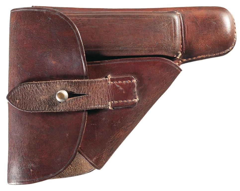 Chambered in the very desirable 22LR caliber, this scarce caliber PPK pistol was produced through the Walther production cycle on a very limited basis for both commercial and military contracts. The pistol falls right in line with the noted serial number range of those listed on page 70 in the book on Walther PP and PPK pistols by James Rankin Vol 1. The slide has the Walther legend with "Cal. 22" on the left side. Commercial "Crown/N" proofs are present on the right side of the following components: slide, chamber and barrel muzzle. It has the 90 degree safety and magazine release on the left side of the frame. Fitted with checkered wraparound grip with the Walther banner at the top. The pistol comes with a total of two magazines with one of the magazines having the brown plastic extension that matches the grip. The brown leather holster is unmarked.