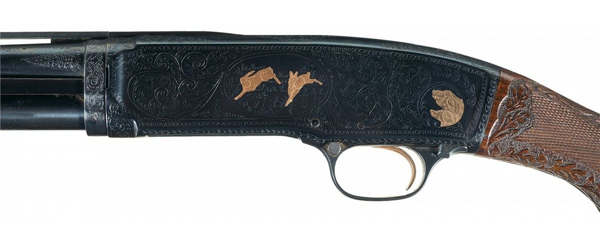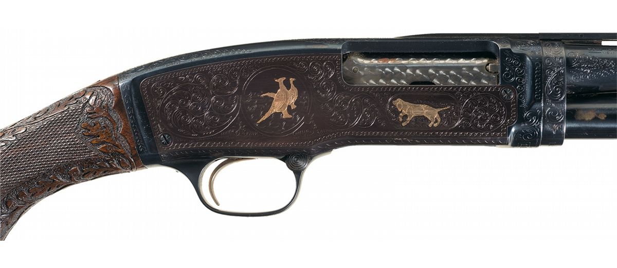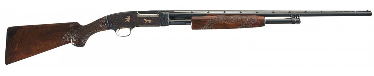 Manufactured in 1934, the second year of production. The sides of the receiver are engraved with floral scroll designs with a panel scene on the left side showing two gold inlaid rabbits in a field along with three dog heads inlaid in gold at the rear of the receiver. The right side shows two pheasants in a panel scene with a dog on point in another panel. The barrel has a 1 inch wedge of floral scroll engraving on each side at the breech, a Simmons vent rib with a single white bead sight, is choked modified and has a 3 inch chamber. Mounted on a nicely figured, oak leaf and acorn relief engraved, extended walnut forearm and pistol grip stock with hard rubber grip cap and checkered hard rubber buttplate. Length of pull is 13 5/8 inches.
