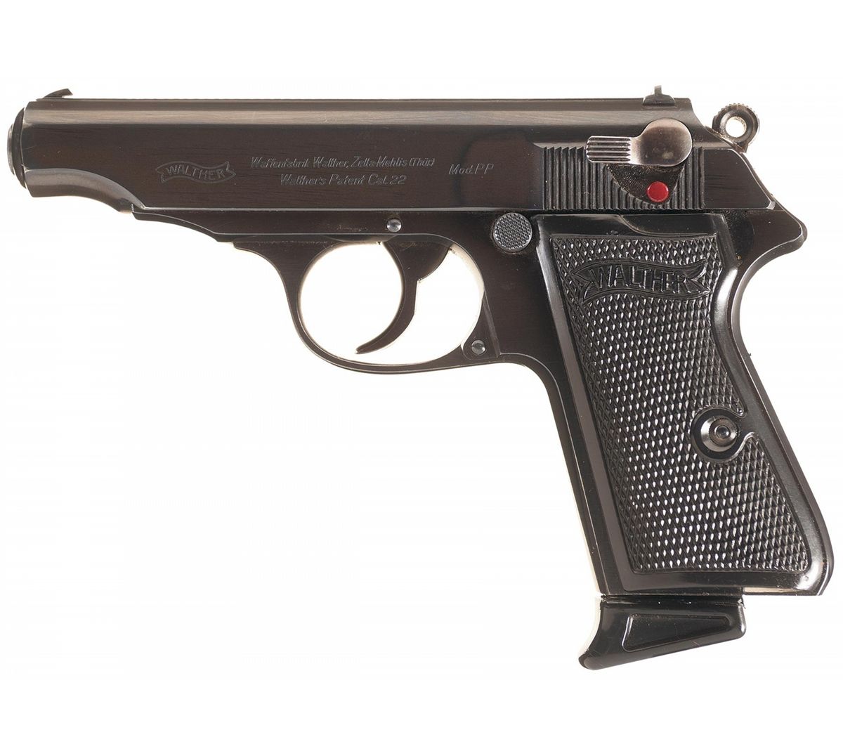 This is an example of a pre-war commercial production Walther Model PP pistol in 22 LR caliber. The left side of the slide is marked with "WALTHER" in a banner trademark next to "Waffenfabrik Walther, Zella Mehlis (Thur) over Walther's Patent Cal 22 MOD PP". The right side of the barrel and slide have the Nazi Eagle "N" proof with the P suffix serial number on the frame vertically behind the trigger. It has fixed sights, the later 60 degree safety area, the Walther Banner marked black plastic checkered grips and an unmarked blue magazine with a black plastic extension.