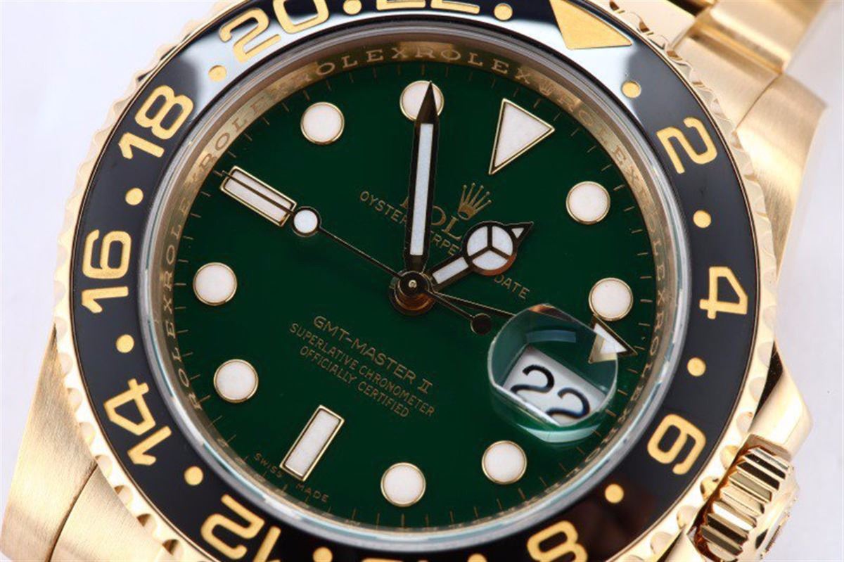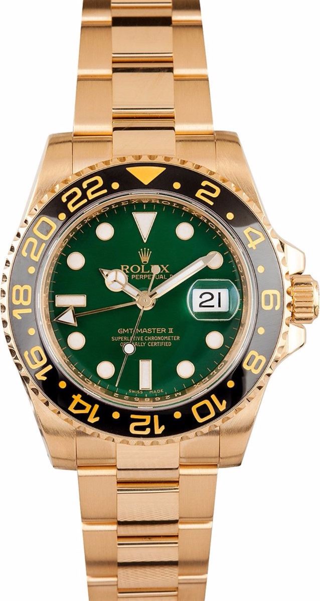 Model/Style-GMT Master II 116718 Serial/Year-Random Features-Automatic GMT movement w/ date and 2nd time zone, Quickset, scratch-resistant sapphire crystal, waterproof screw-down crown Case-18k yellow gold w/ black and gold bi-directional rotating ceramic bezel, inner reflector ring engraved w/ serial number Bracelet-18k Yellow Gold Oyster w/ Glidelock clasp #9077