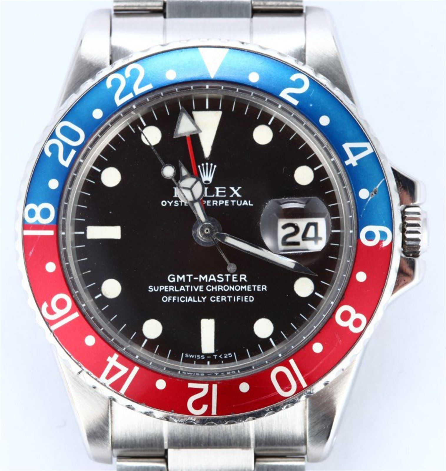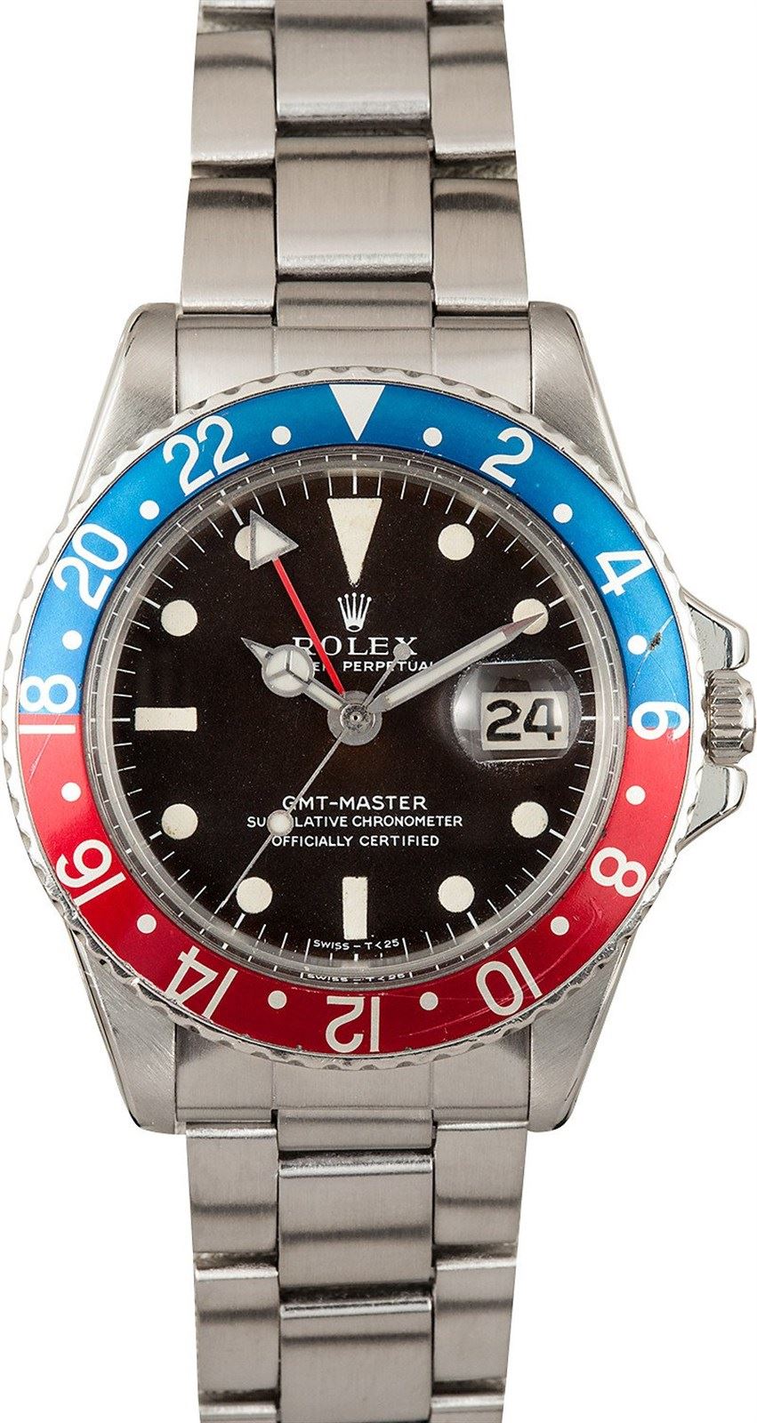 Model/Style-GMT-Master 1675 Serial/Year-Random Features-Automatic movement w/date and GMT hand, acrylic crystal, waterproof screw-down crown, rotating bi-directional timing bezel Case-Stainless steel (40mm) w/ naturally faded red and blue "Pepsi" fat font bezel insert, pierced lugs. Case is in excellent condition w/ slightly rounded edges Bracelet-Stainless steel 7836 Oyster w/ 12 foldover links, 280 endlinks #9114
