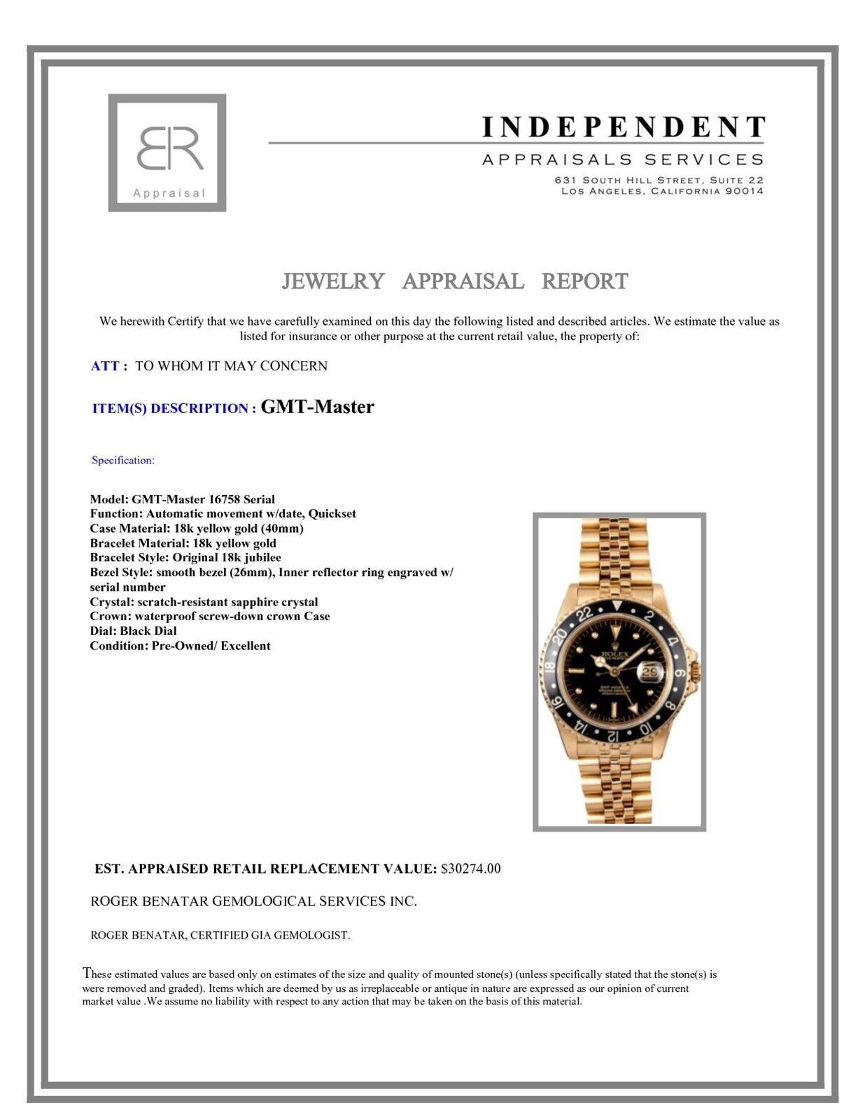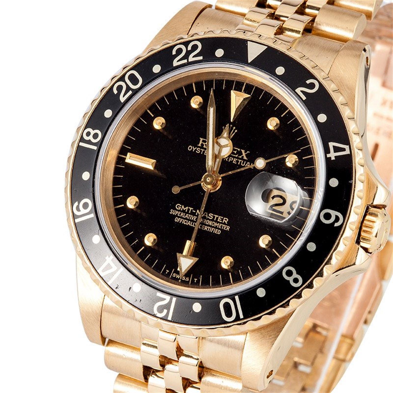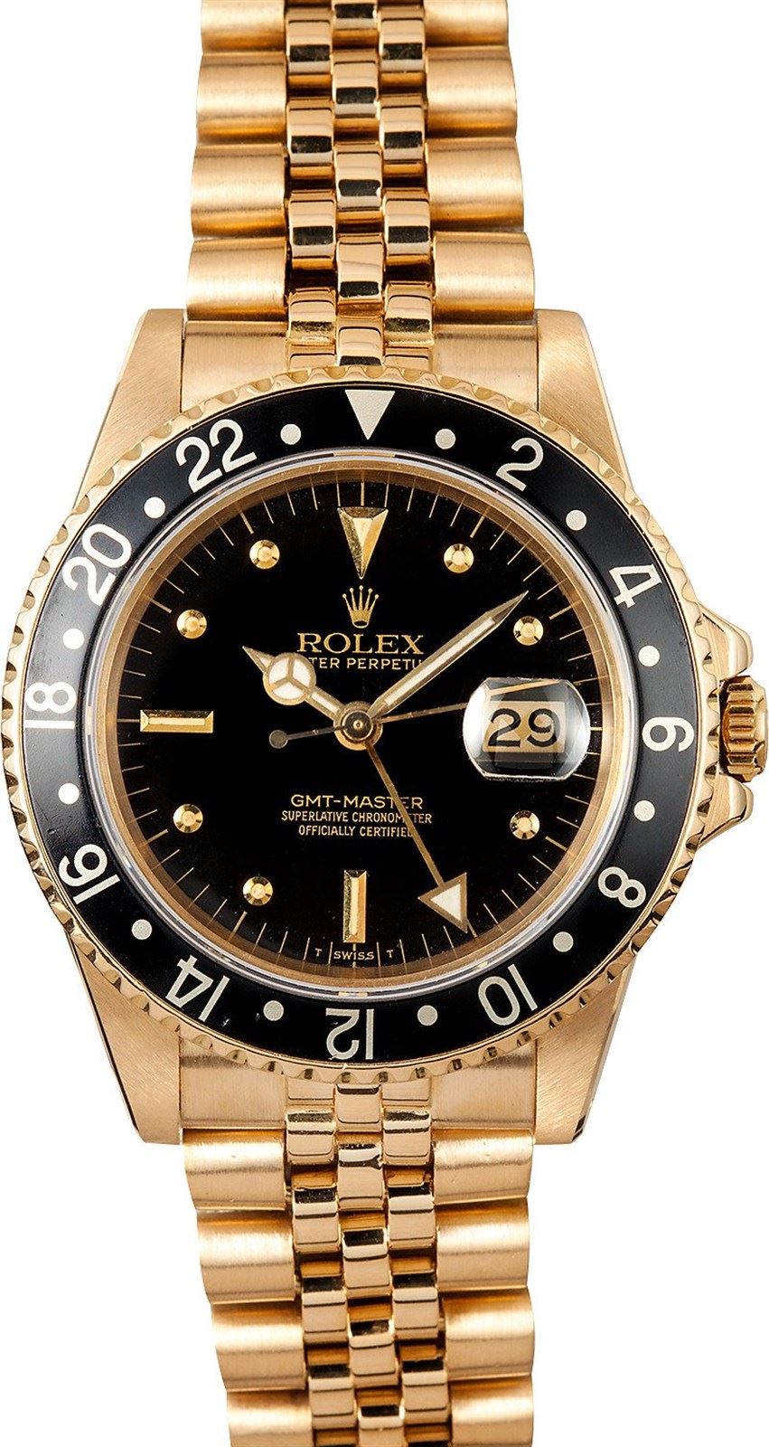 Model/Style-GMT-Master 16758 Serial/Year-Random Features-Automatic movement w/ date, quickset, scratch resistant sapphire crystal, waterproof screw-down crown Case-18k yellow gold (40mm). Case is in excellent condition with sharp beveled edges. Bracelet-Original 18k jubilee bracelet is in excellent condition. #9101